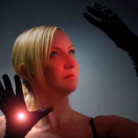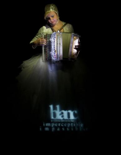 Her unique and highly original appearance is both mesmerising and compelling and along with her transparent luminous accordion designed for her by British artist Paul Etienne Lincoln she also has luminous shoes and costumes.