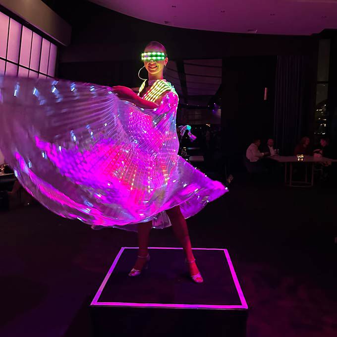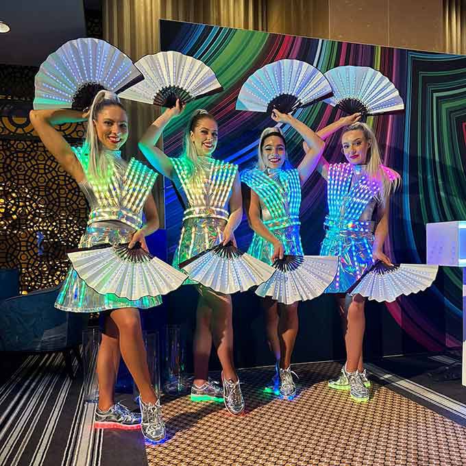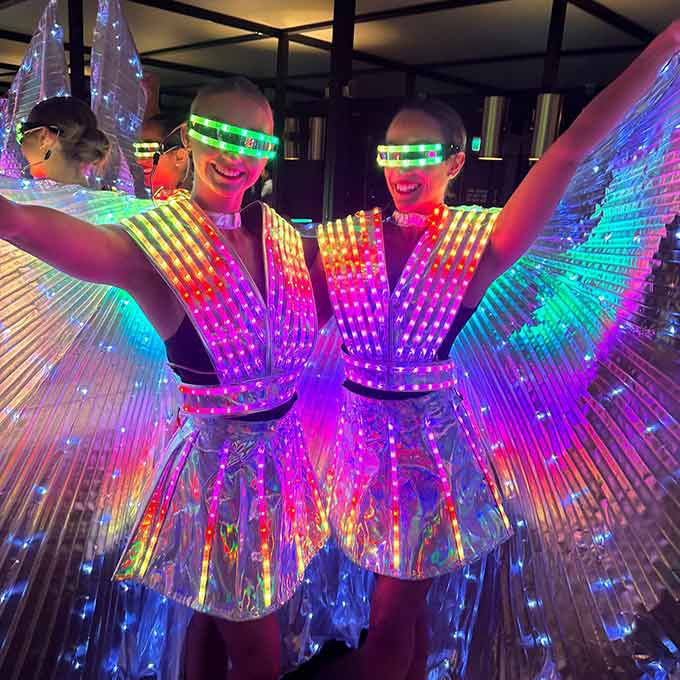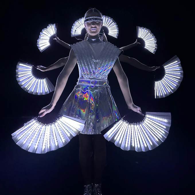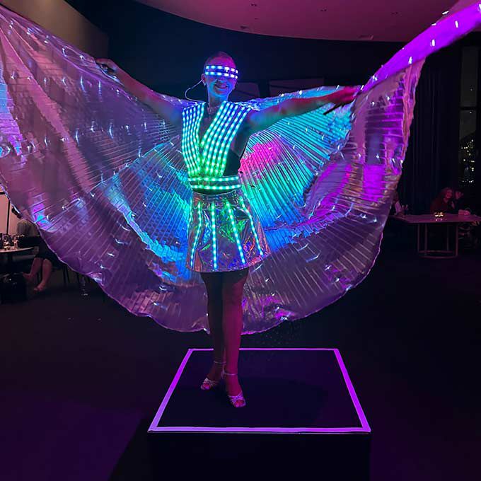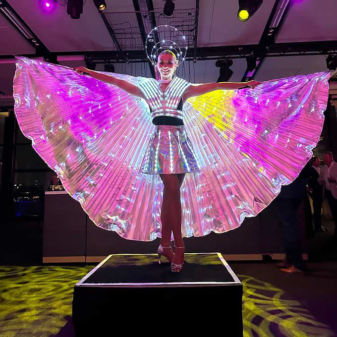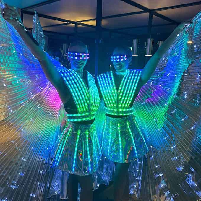 Futuristic LED dancers can create a cutting-edge highlight to events, performing choreographies to an upbeat soundtrack wearing LED wings or fans
