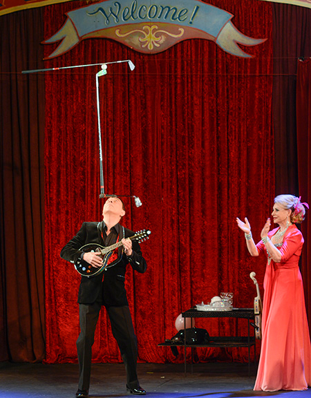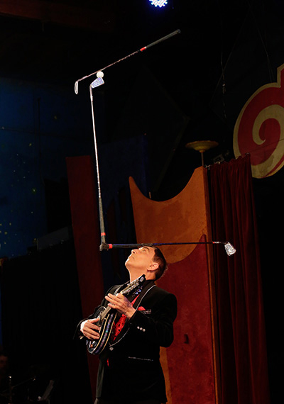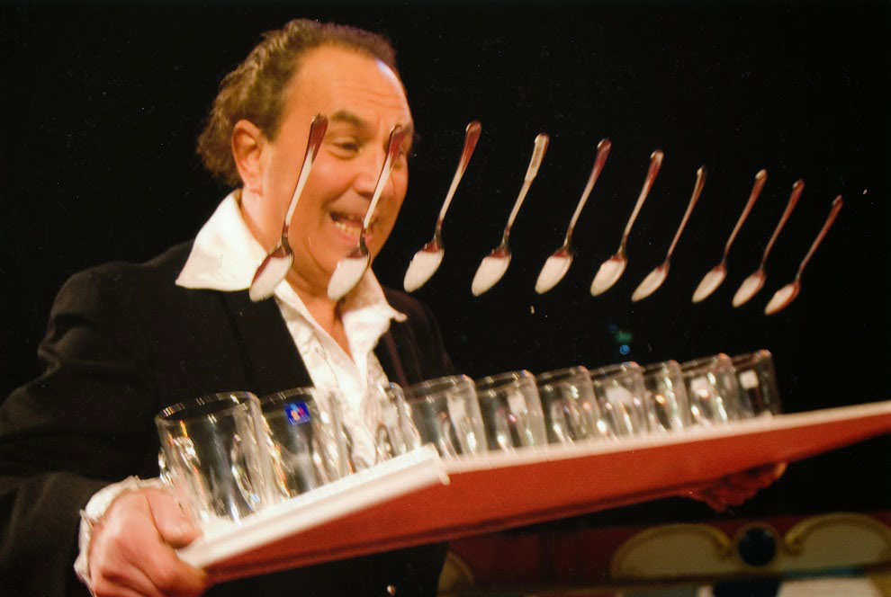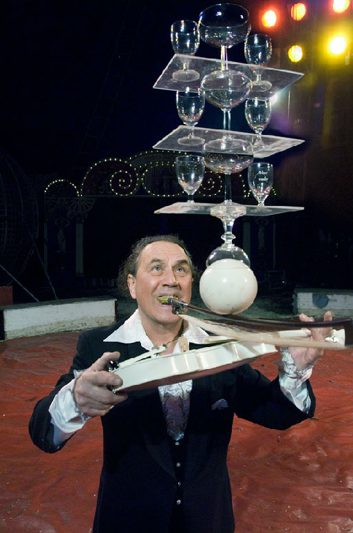 Some of these tricks include balancing three golf clubs on his head whilst he plays the French Cancan on a mandolin as well as balancing 10 champagne glasses on a violin stick, whilst he plays the violin at the same time; a remarkable feat never seen before!