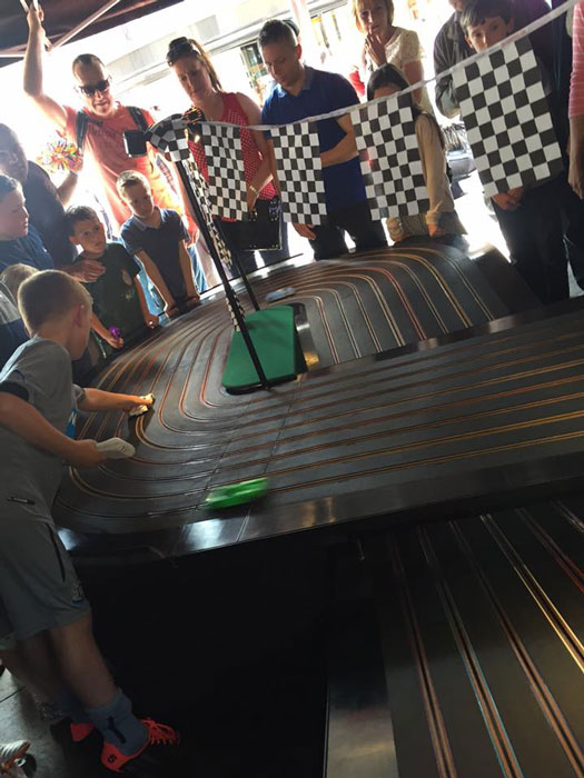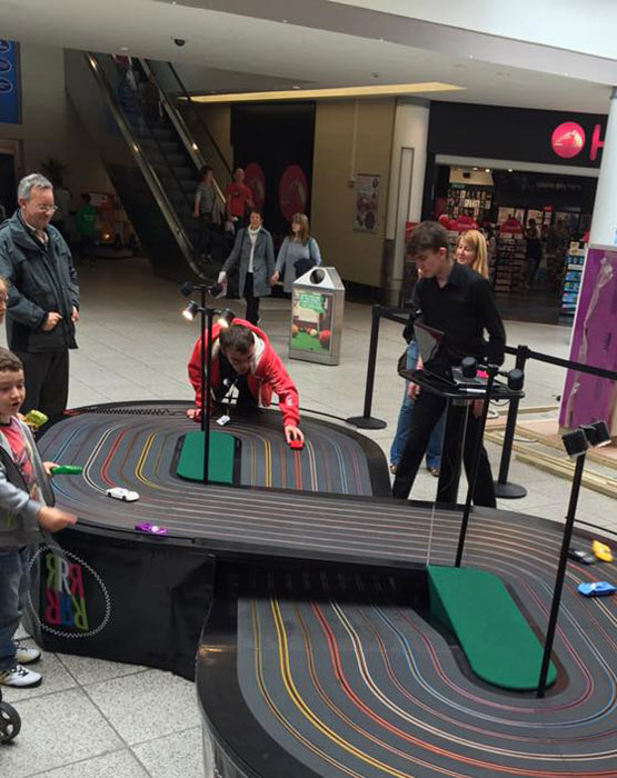 The giant Scalextric track hire is not only a fantastic team building activity that can encourage work bonding and social engagement but a wonderful marketing tool. With the possibility of accommodating around 400 players every hour or 2000 people in an eight hour day, our giant Scalextric track can be fully customised with company branding or logos. It is ideal if you want to fill a large space and entertain a high number of people in a short amount of time.