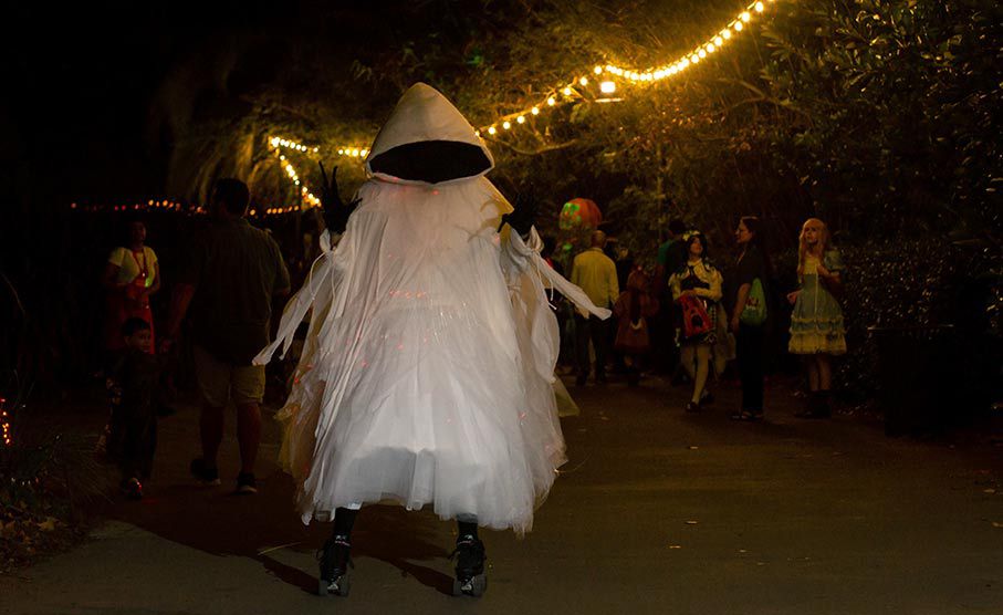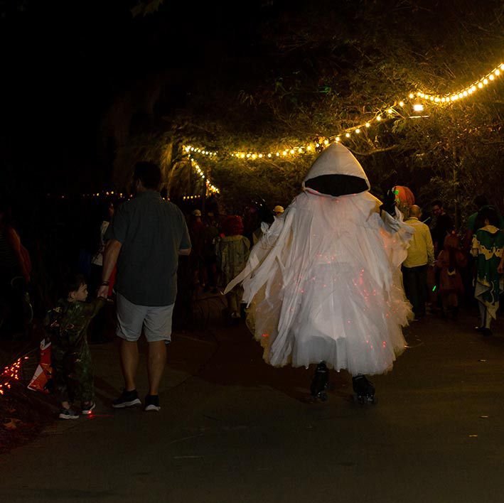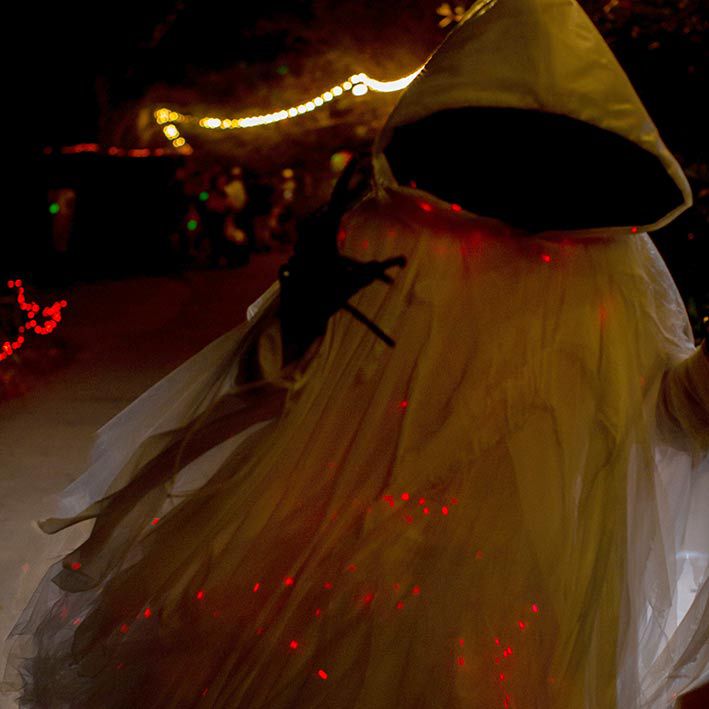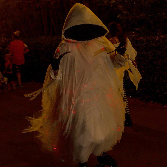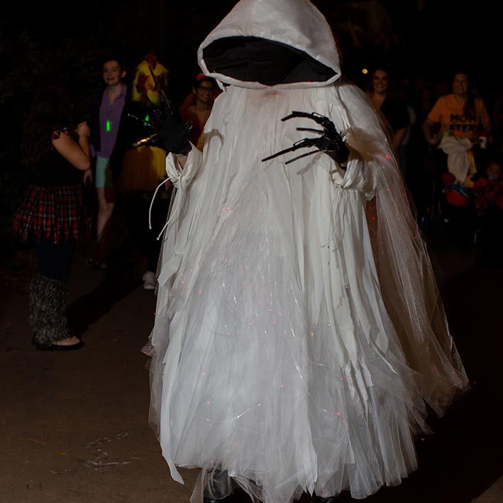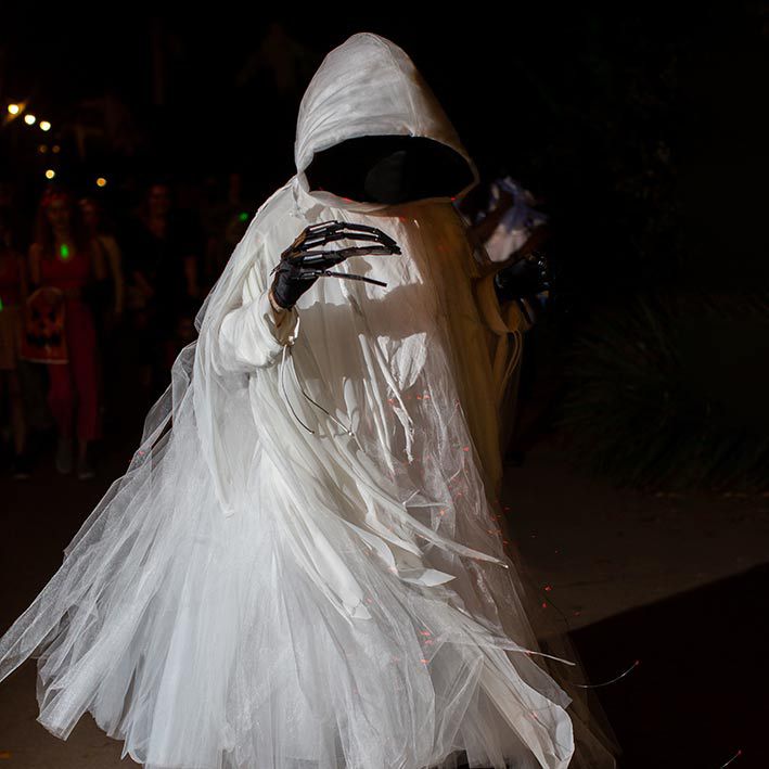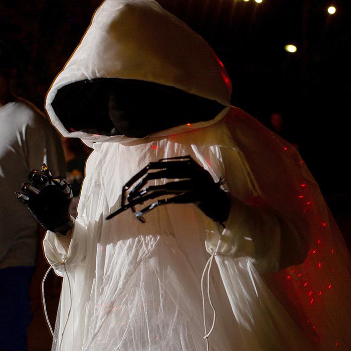 Book our ghoulishly spooky faceless character to roam at your Halloween party or event; our creepy gliding character is also great for parades