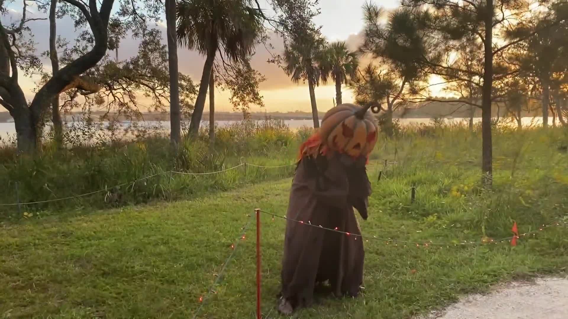 Introducing our spooky Glowing Pumpkin Character dressed in a handcrafted costume that glows with low lighting to have a Jack-o'-lantern effect