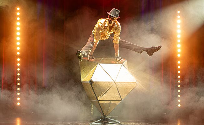 His golden-themed hand balance show merges nostalgic vintage aesthetics with innovative, contemporary choreography for a fresh entertainment style