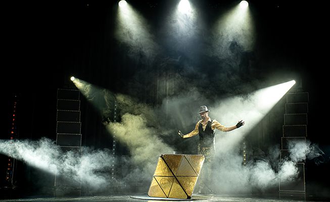 Featuring a striking, golden, rotating puzzle cube prop that adds movement and intrigue to every live show, this themed acrobat captivates audiences