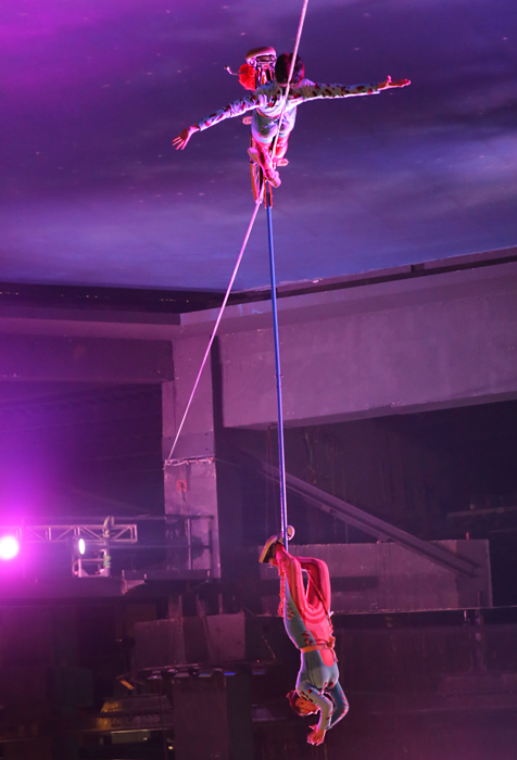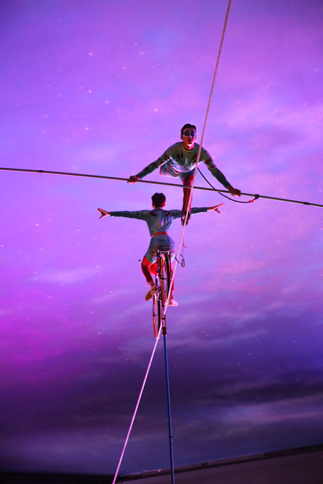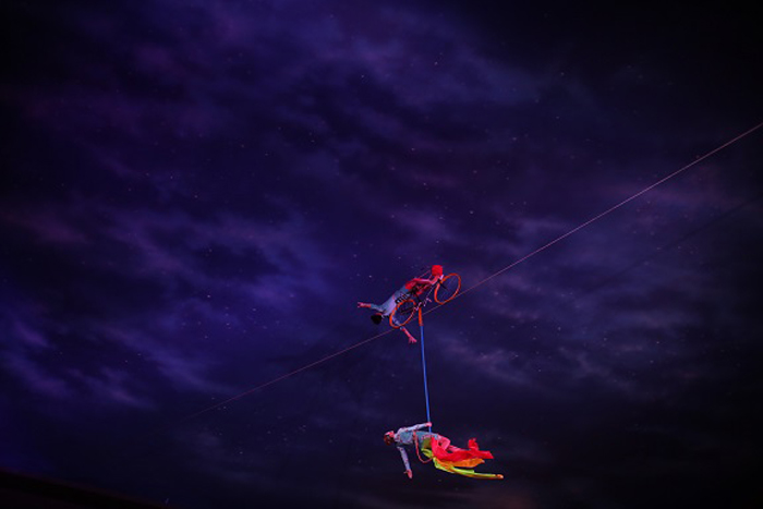 The cyclist is the focal point of this stunning aerial show. Even though he rides on an old vintage bicycle, it has been colourfully decorated to match the colours of the performers' costumes. A graceful aerialist with long flowing ribbons is attached to the bike and swoops over the crowds. A third high wire artist joins in and all three performs frightening balancing acts that keep the audience in complete awe. Even the cyclist can be seen balancing off his bike hundreds of feet above the crowd.