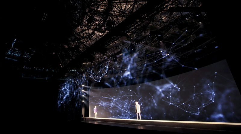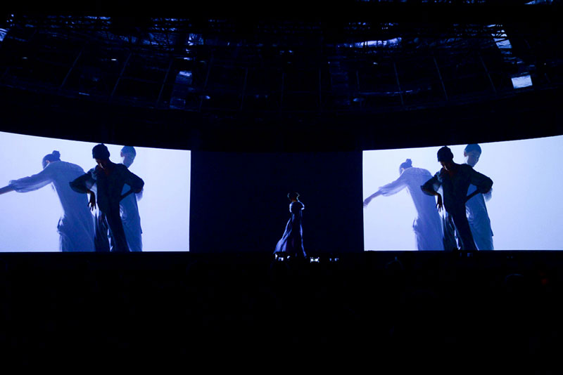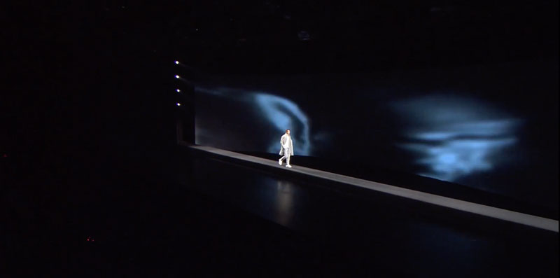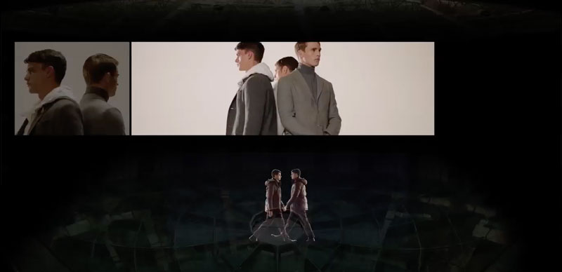 Pre-filmed models are combined with graphic elements and layered with real-life models on stage to create a striking three-dimensional and multimedia performance.