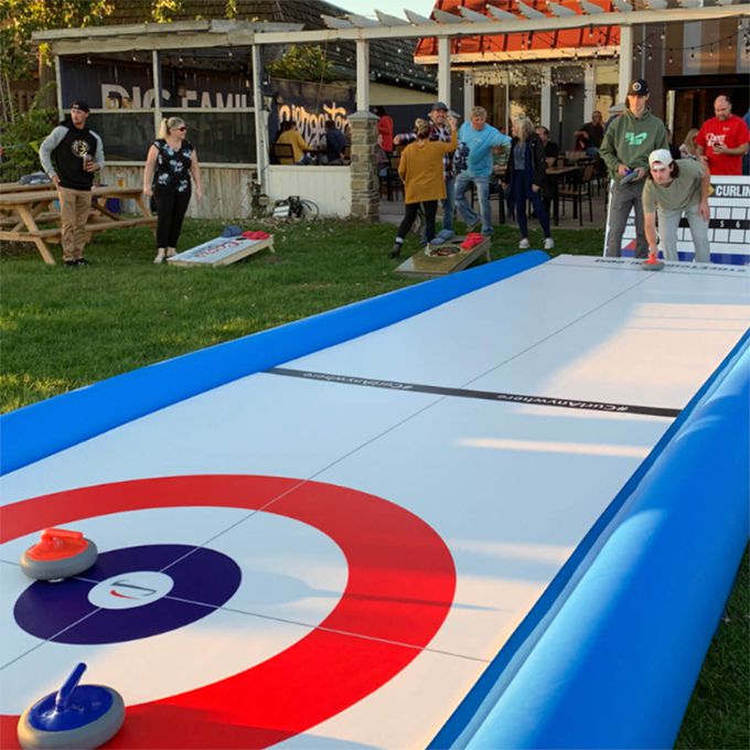 This simple setup is a portable, inflatable version of the Olympic sport of curling and allows for game play, indoors or outdoors, without real ice