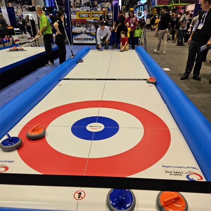 A synthetic “ice-like” surface with inflatable borders provides a flat play area that simulates curling