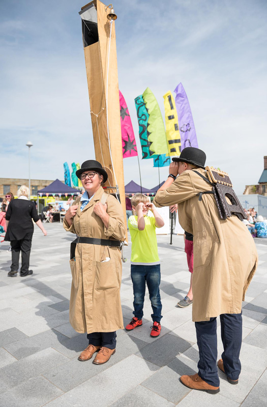 In costumes, the act seem like mad explorers trying to find somewhere new. With a giant, mounted periscope on the back of one, the other follows around, looking in and teaching people how to look in. As it’s a little difficult for observers to look through the periscope while it’s on the move, the pair regularly stop at points of interest for the kids (and adults!) to have a peep at the world around them.