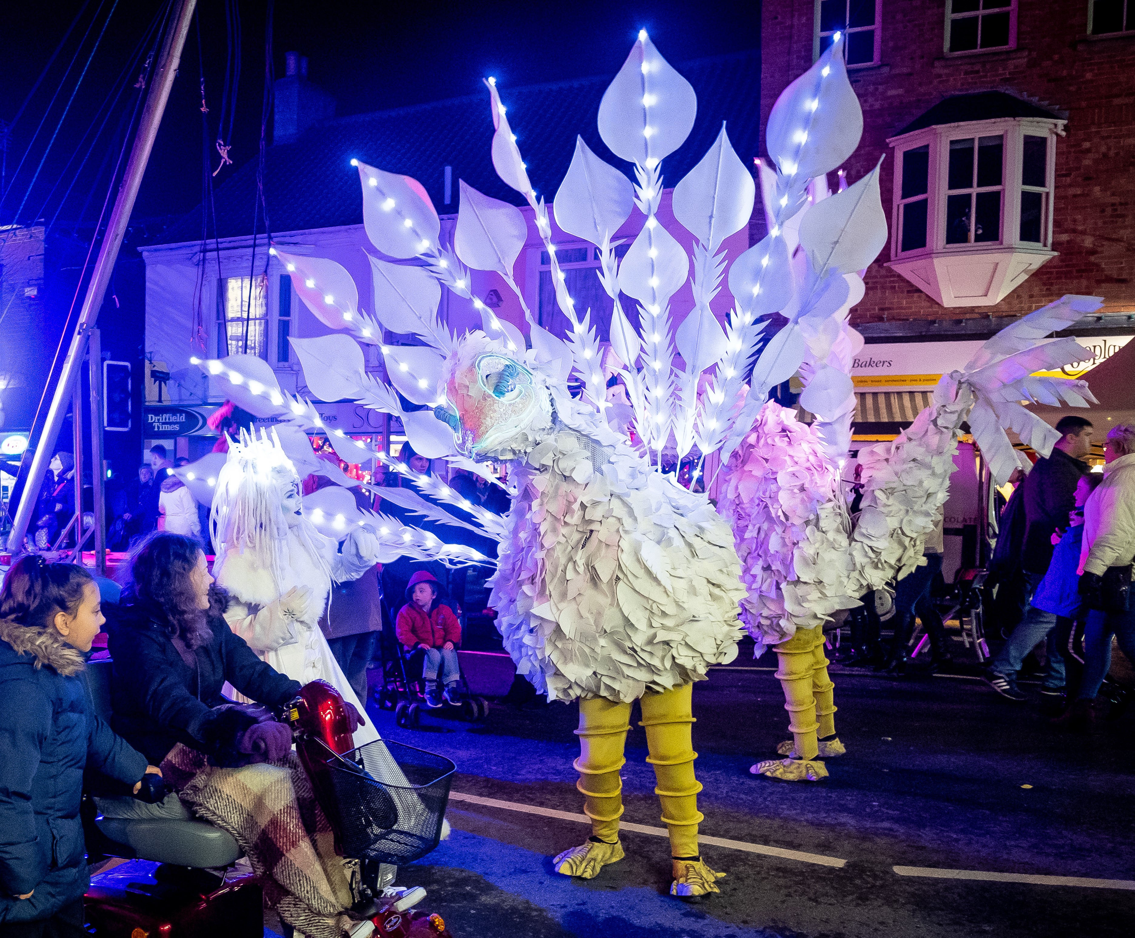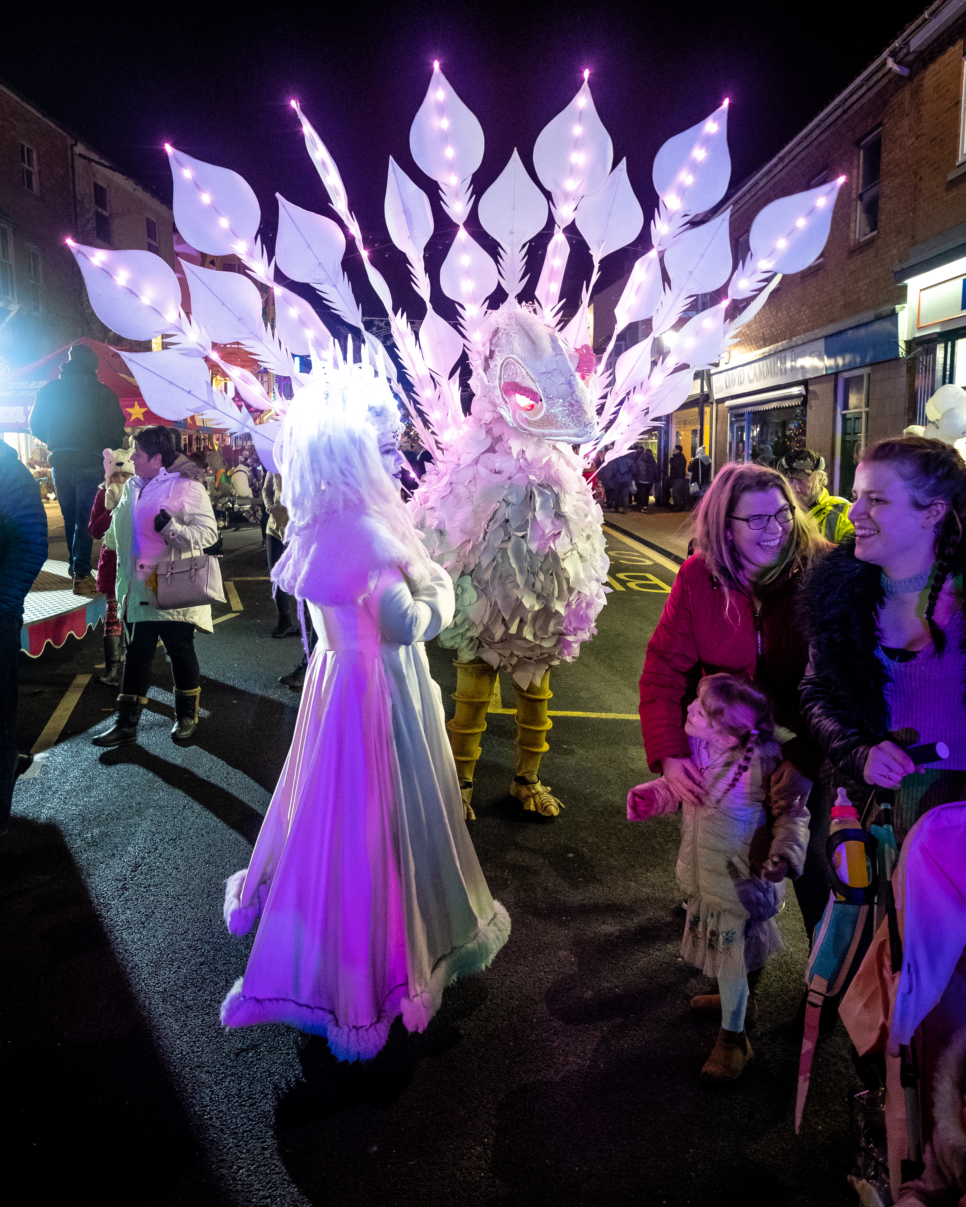 A beautiful glow act, meet some illuminated birds & their enchanting snow queen handler