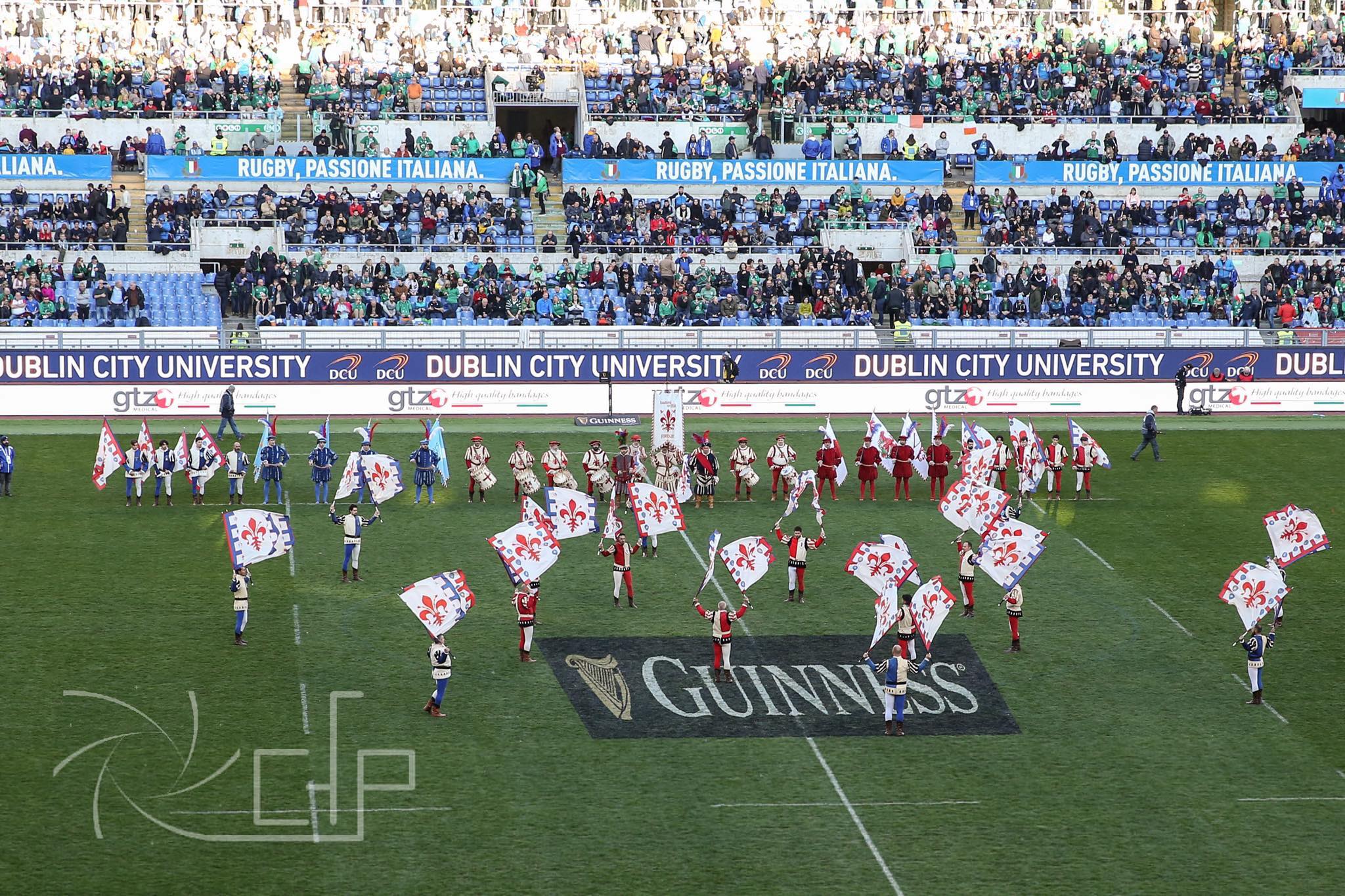Stars of numerous football championships, these traditional flag wavers come with trumpet players and drummers