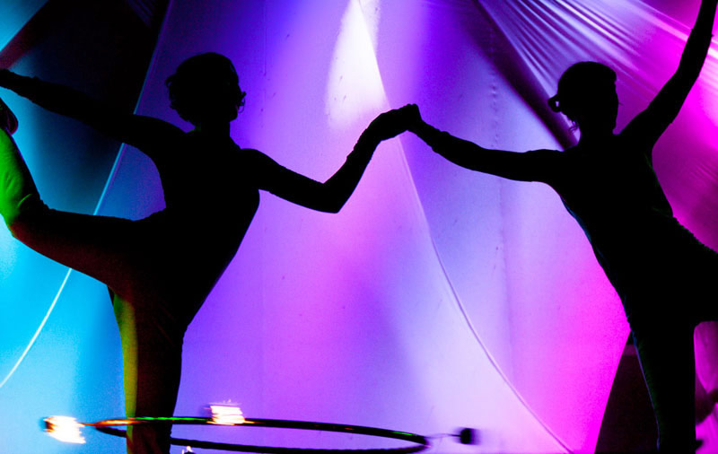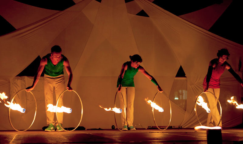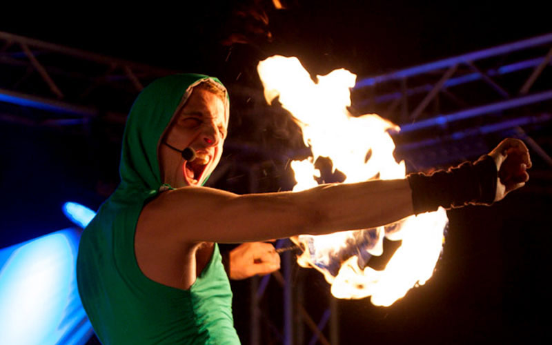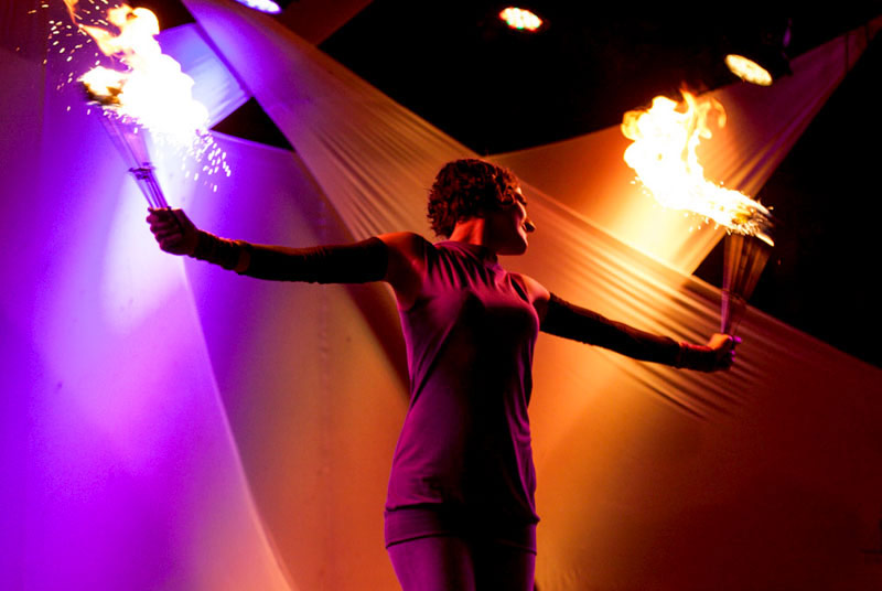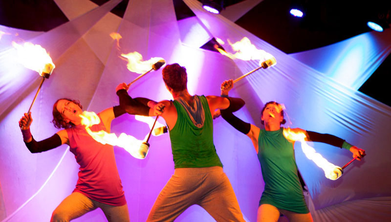 Features novel fire props such as hula-hoops and fire sticks