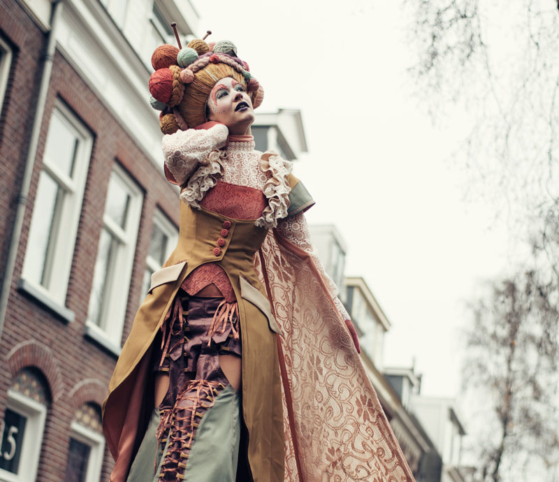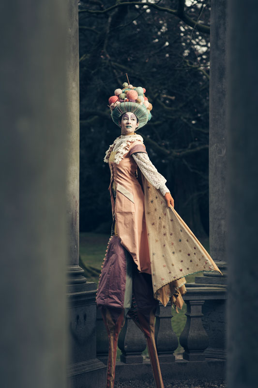 Plaited yarns, lace, ribbons and buttons in soft pastel colours adorn beautifully cut tailored costumes which hark back to ladies’ clothes of eras past. Reminiscent of high fashion couture, these high-end costumed stilt performers are designed to make an elegantly refined and notable statement.