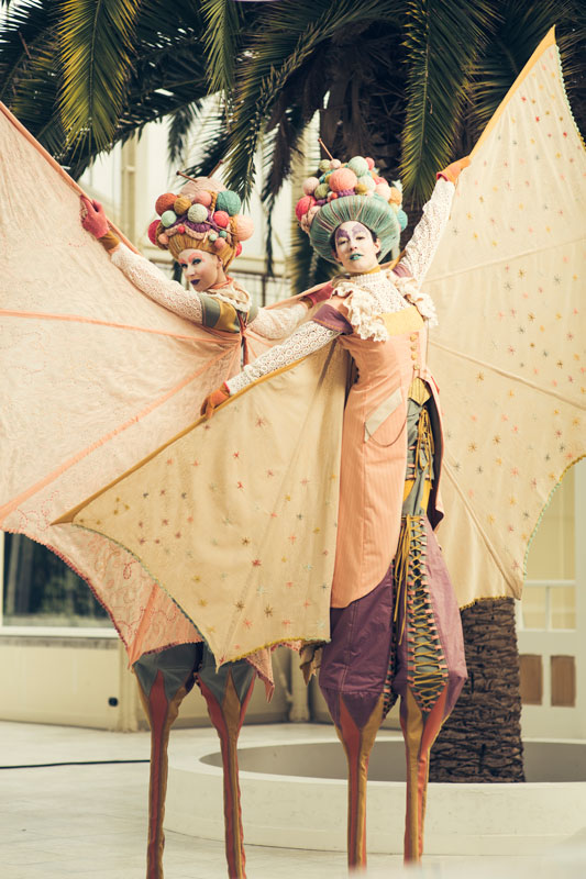 Adding even more drama to the overall look, our walkabout stilt artists carry exquisitely made fabric wings on their backs, which can be opened up into theatrical wingspans.