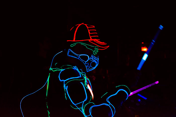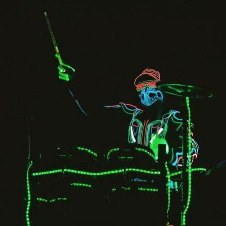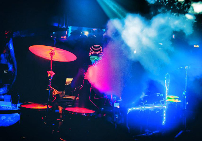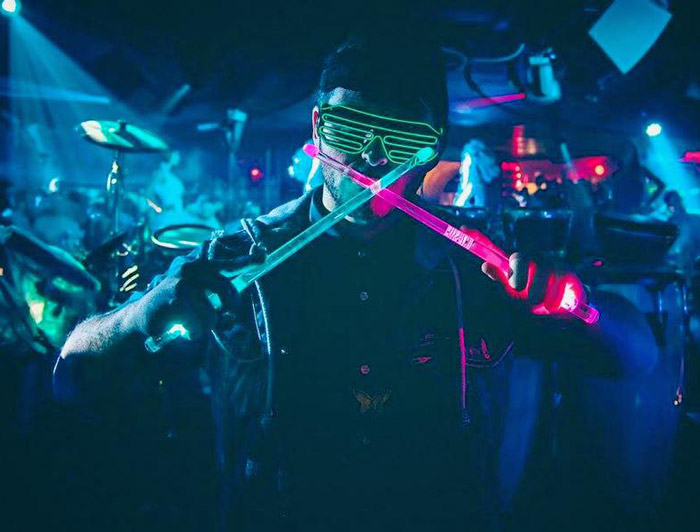 To make his drum show stand out, the percussionist has a unique LED costume and some amazing LED drumming props and instruments that really shine bright when the stage lighting is turned down. He uses an electric drumkit with triggered samples to play along to the backing tracks.