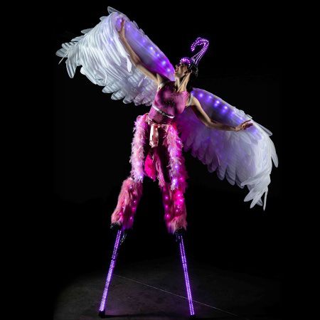 Dressed in pink with impressive white feathered wings, our LED stilt walker is undeniably an eye-catcher and sure to pull attention to your event