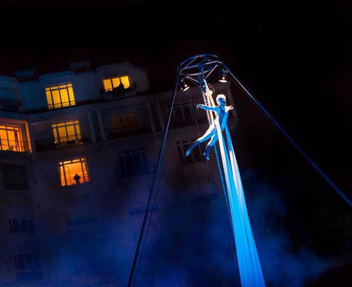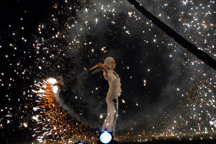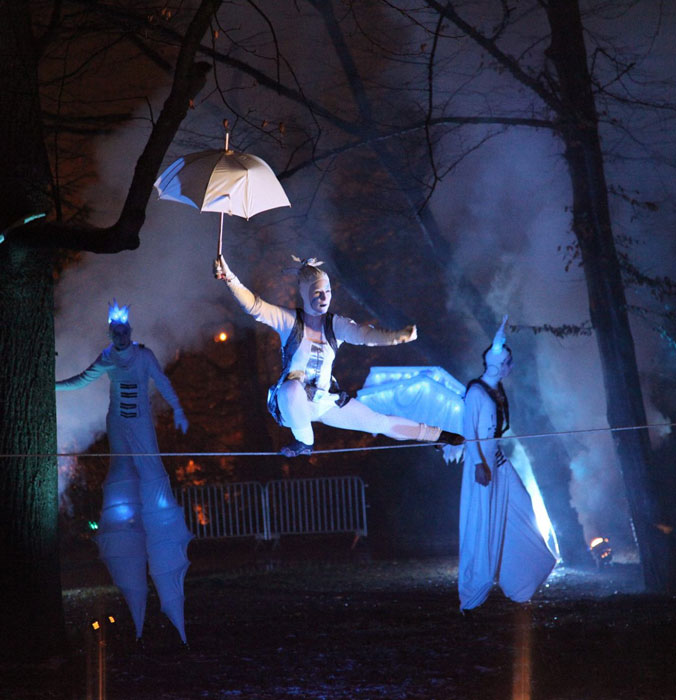 Their dazzling stage show is a combination of LED stilt walkers, fire performance and aerial work