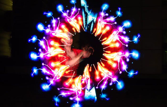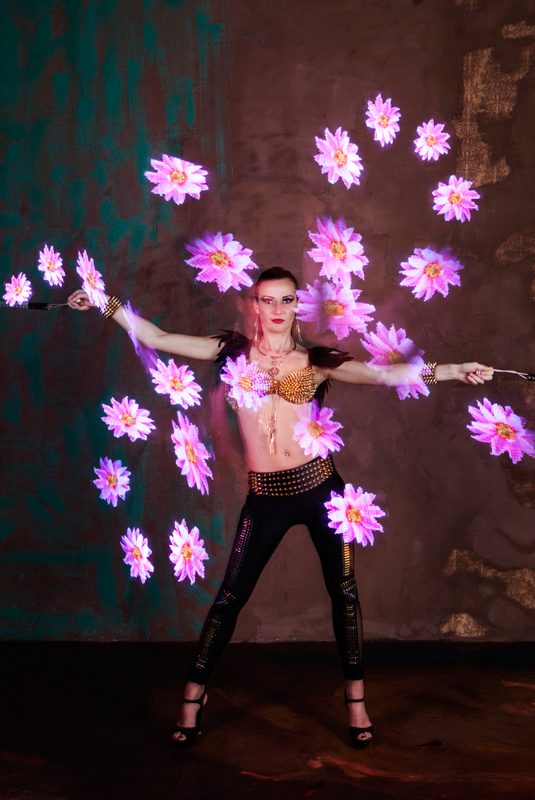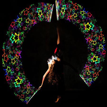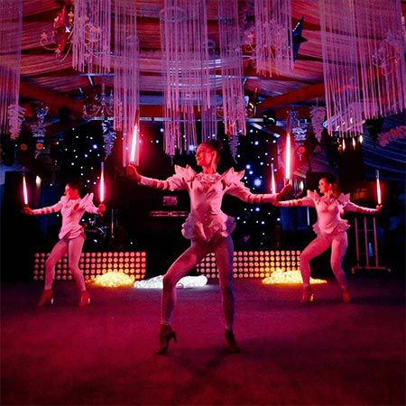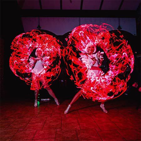 One up to three LED Poi Female Dancers can carry out a LED poi show at your upcoming celebration and create bespoke choreographies and dance to requested music to fit your event’s requirements. This stunning colourful performance doesn’t necessarily need to be executed under completely dark conditions, which makes it suitable for a wide range of events and venues, both indoors and outdoors.
