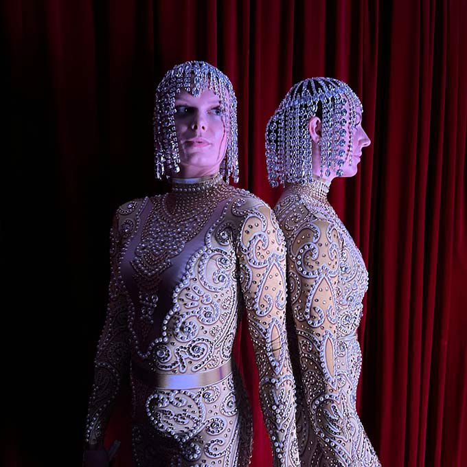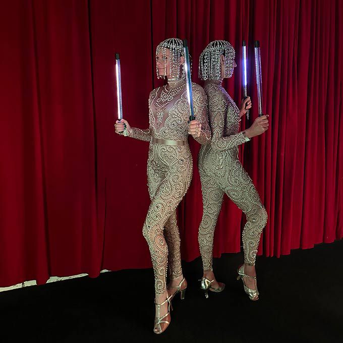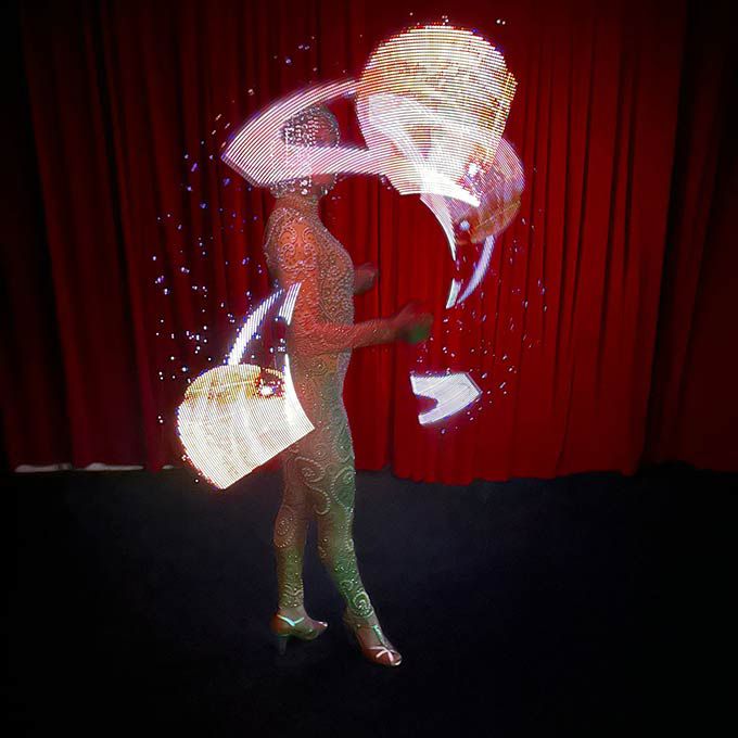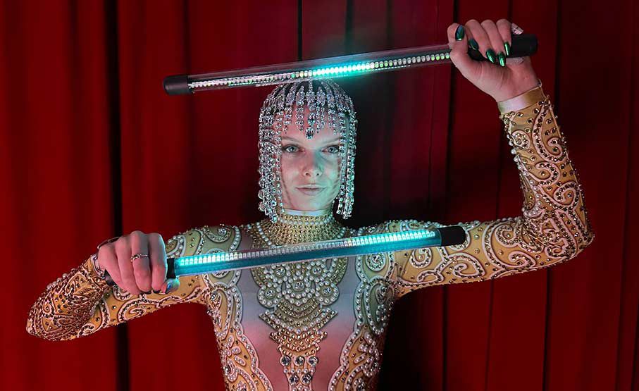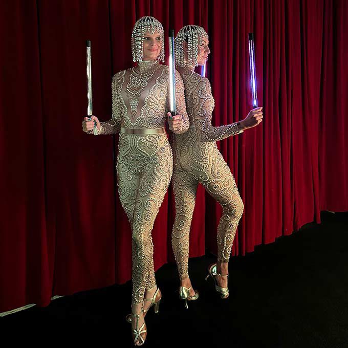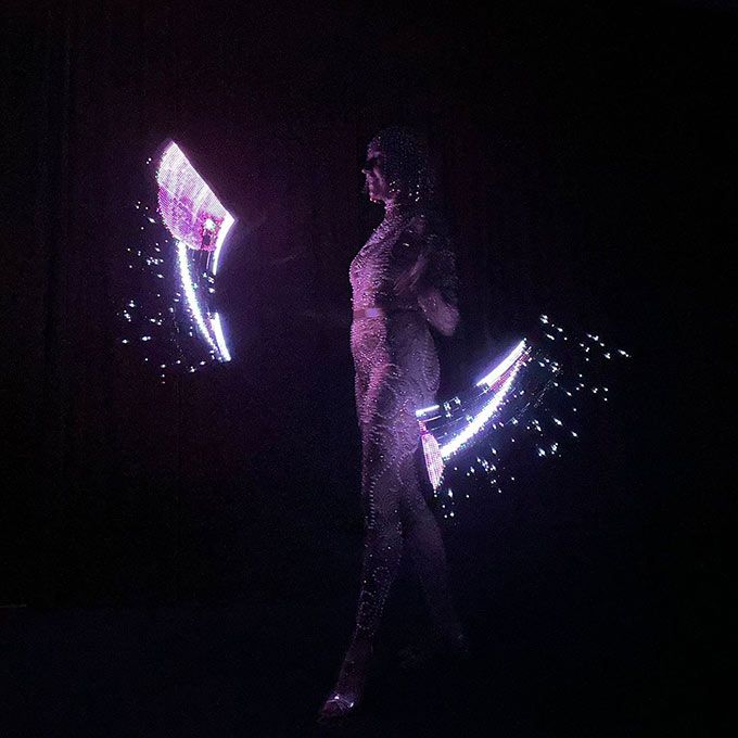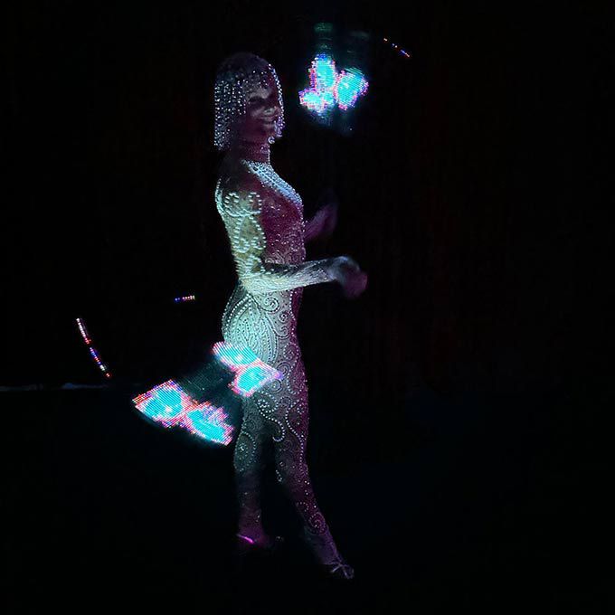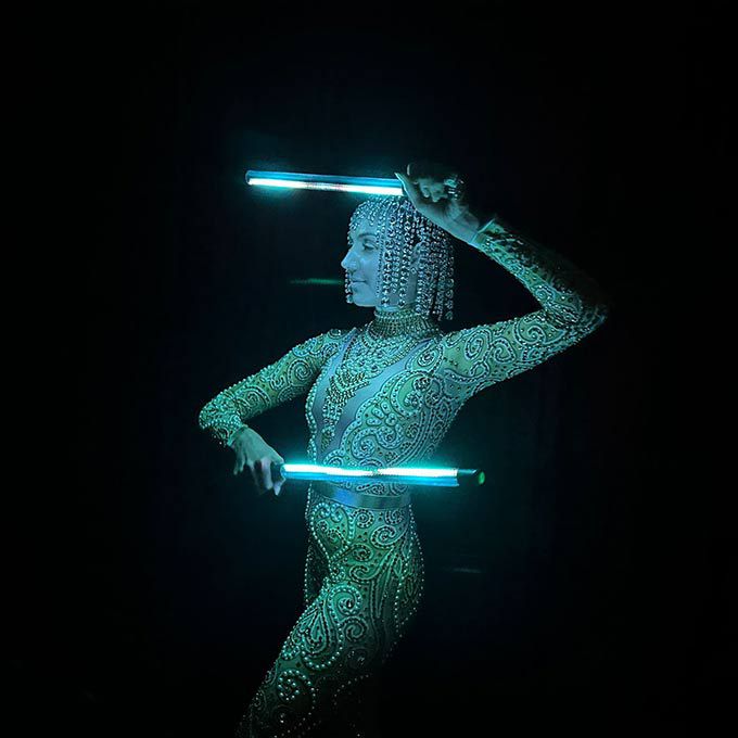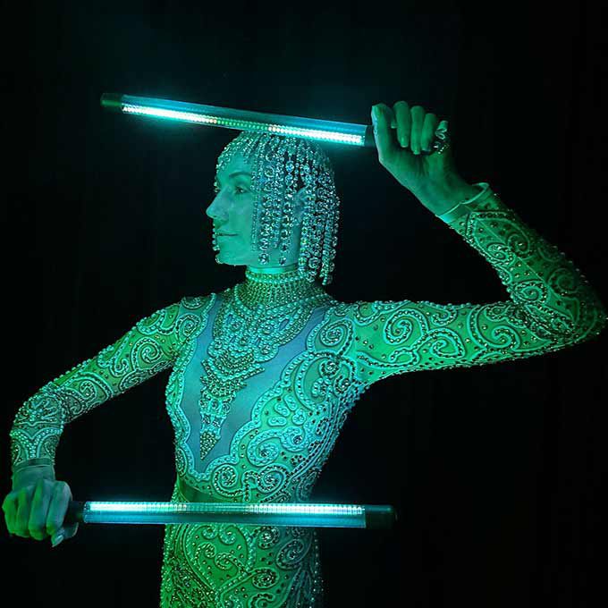 Wearing elegant crystal-covered costumes and using LED props, our poi performers create dramatic LED patterns in the air to mesmerise guests