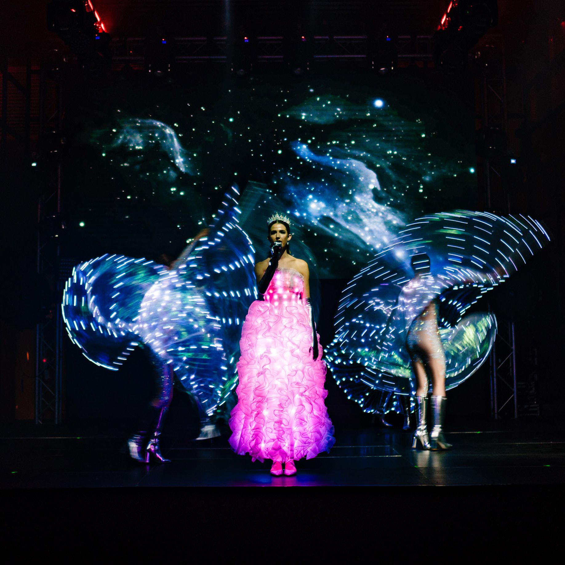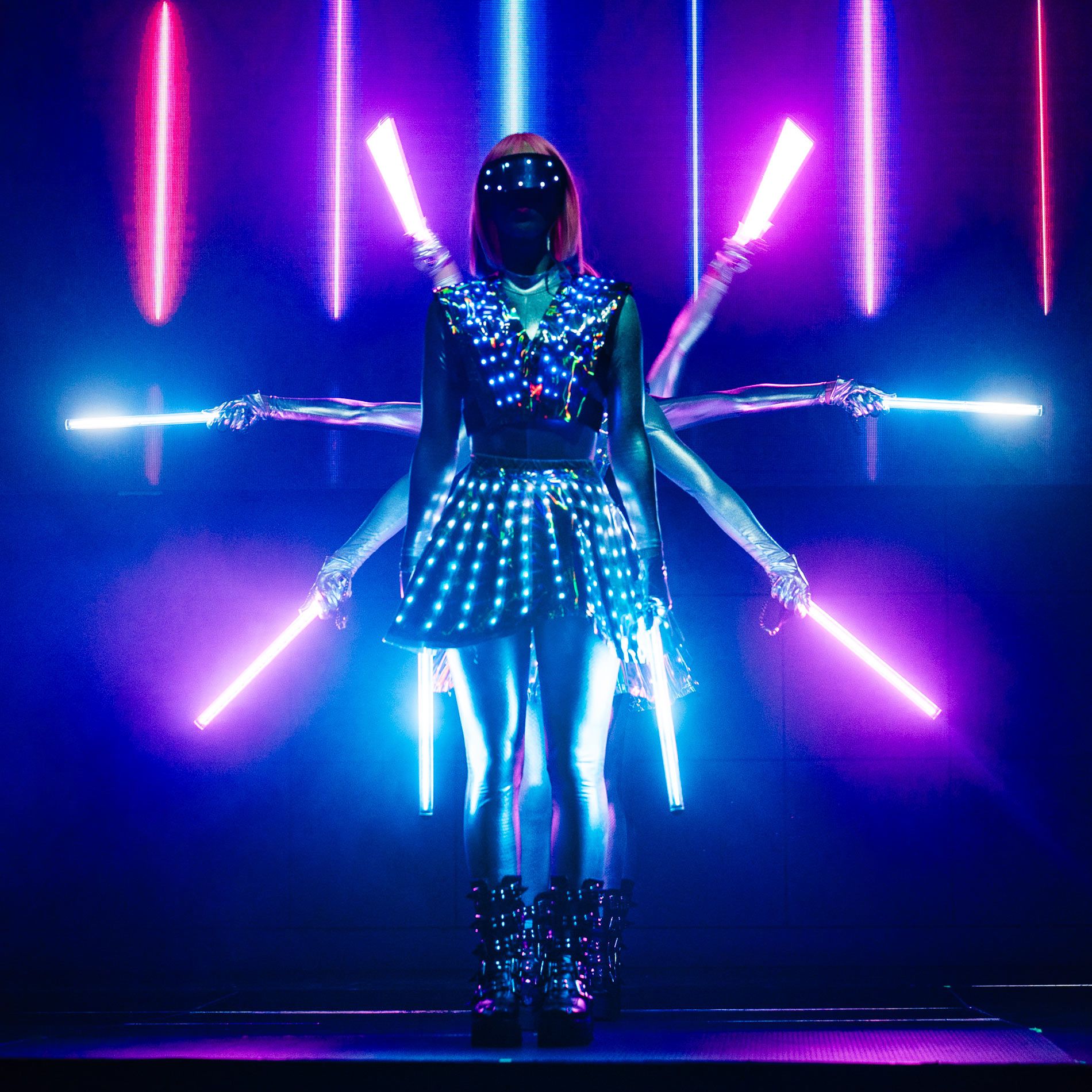 An engaging and interactive show that can be customised to your event, our LED performance features LED props and a programmable dress.