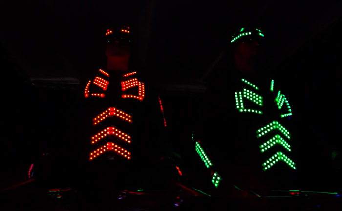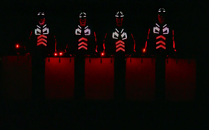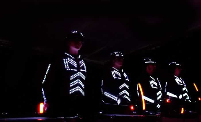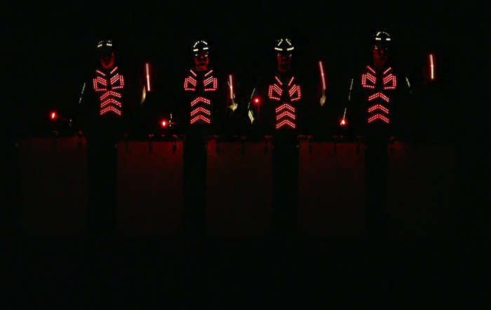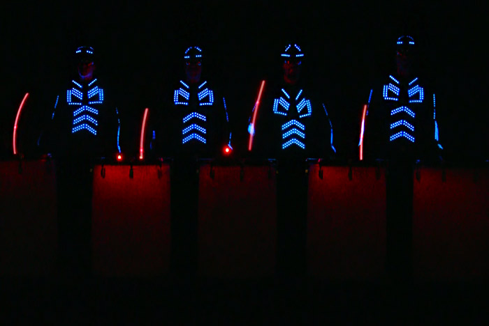 Inspired by the ironing Tron films, the futuristic costume have fully programmable light sequences that accompany the percussive rhythms