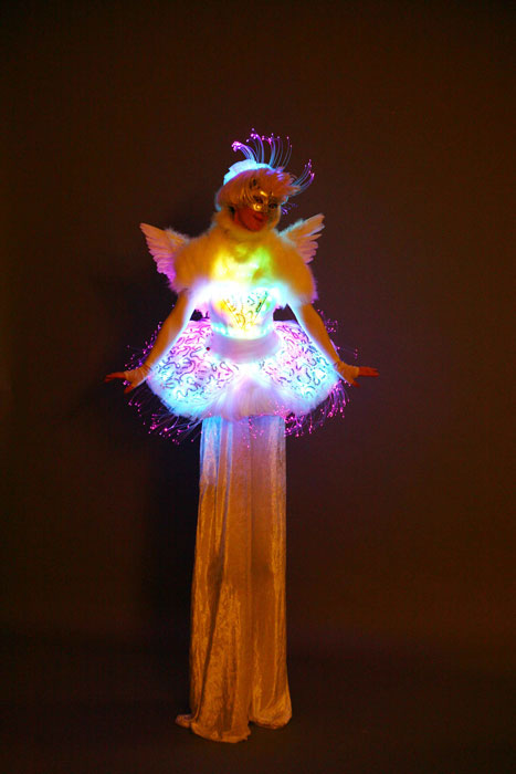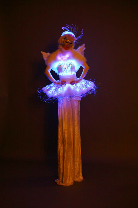 Stilt Walkers- These beautiful “angel” style LED circus performers will tower above your guests, creating an ethereal atmosphere as they pace through the crowds. Spreading calm and tranquility wherever they go, these glamorous stilt characters add class to festivals, corporate functions and wedding receptions.