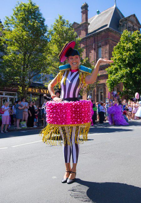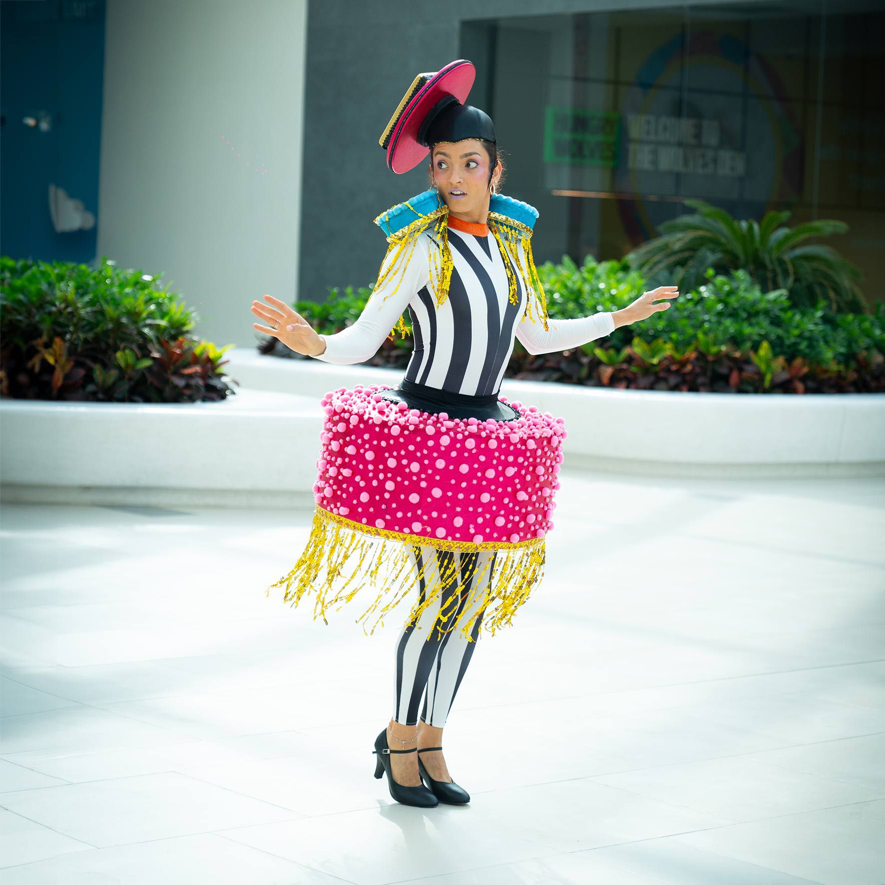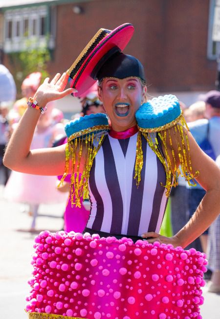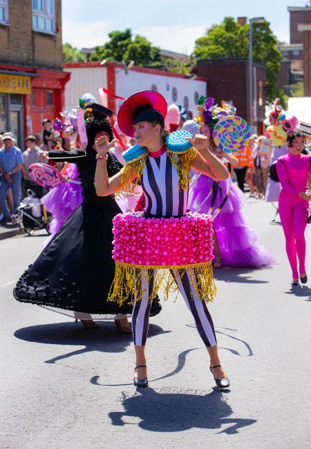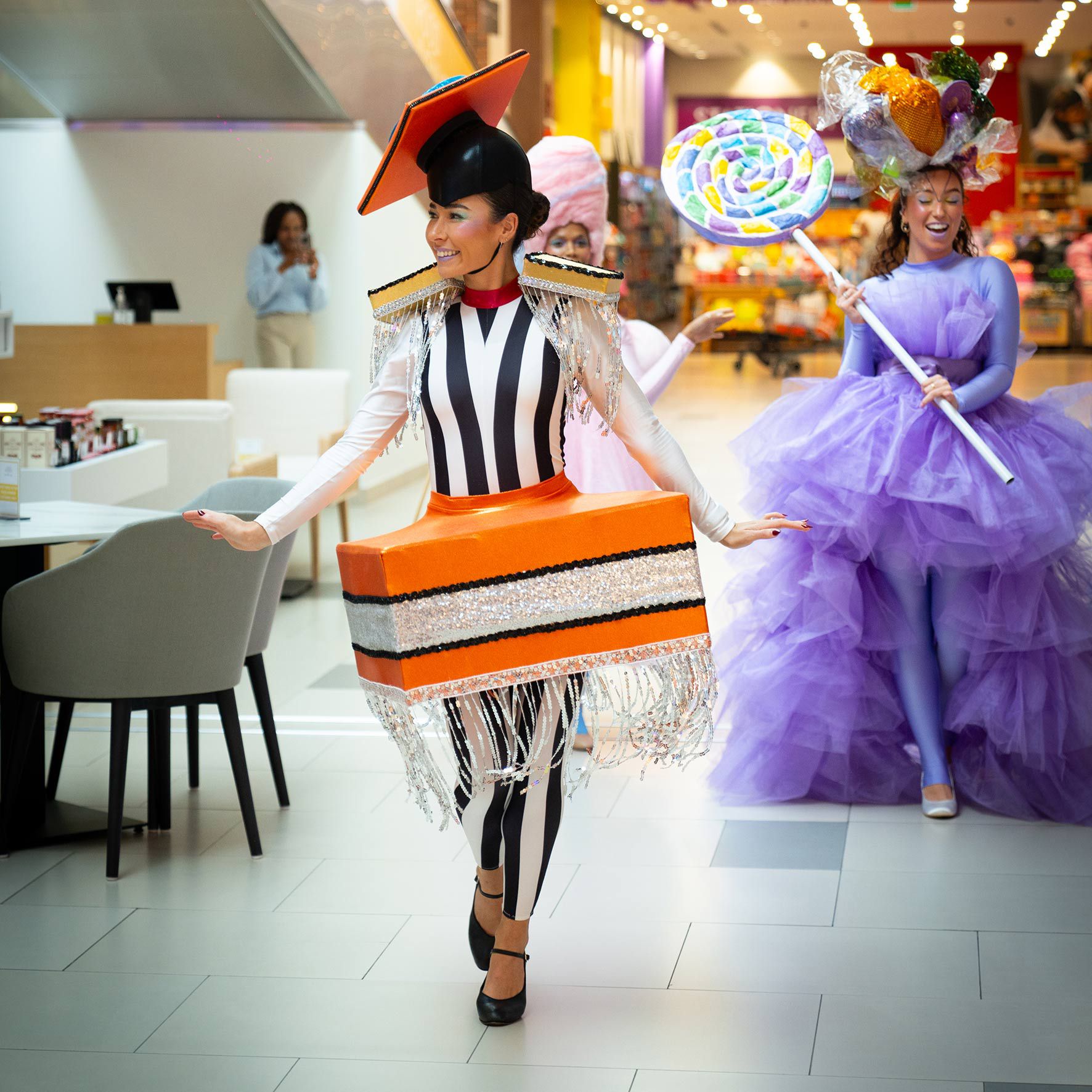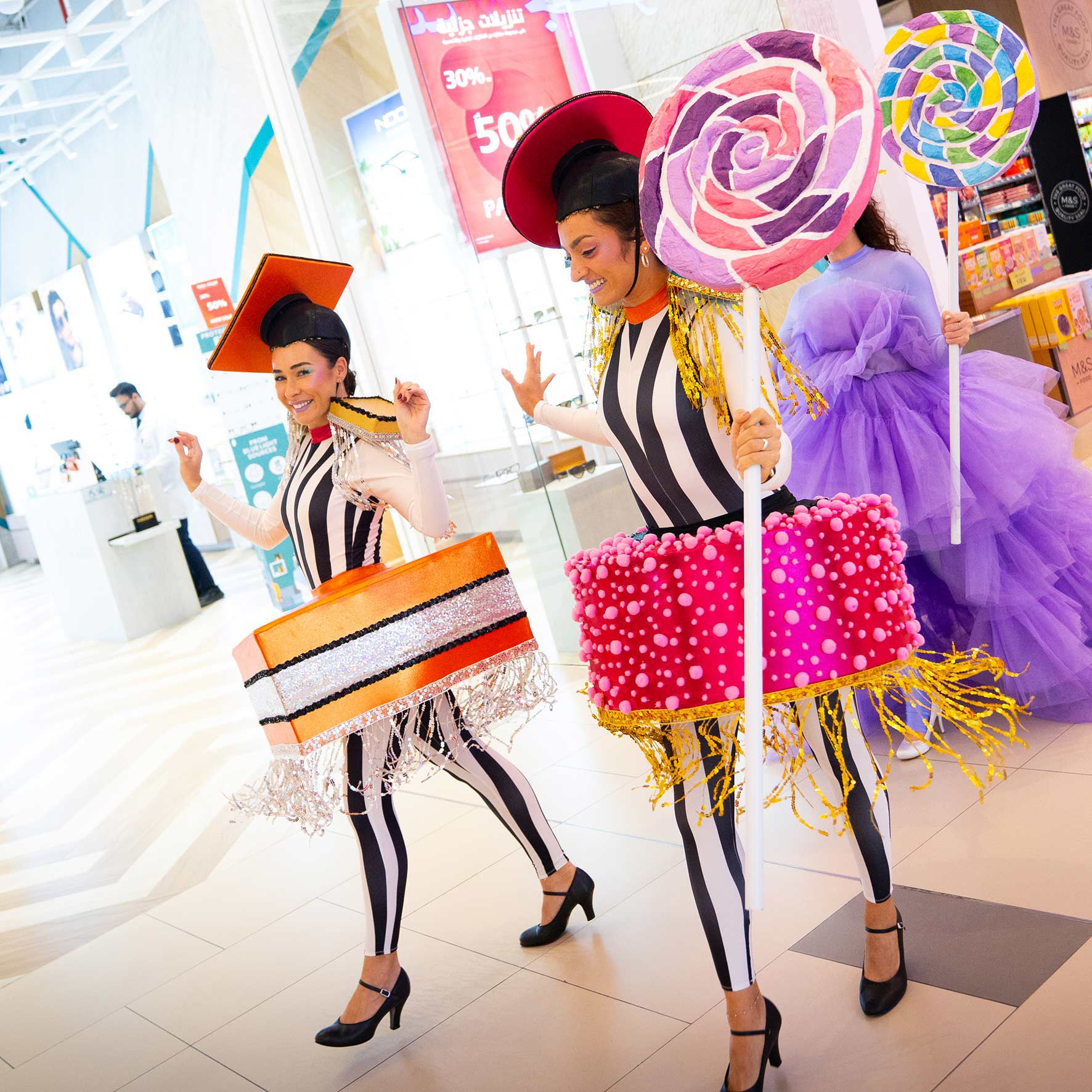 These colourful liquorice ladies bring the fun with their vibrant vintage-themed candy outfits and energetic ambient dance routines