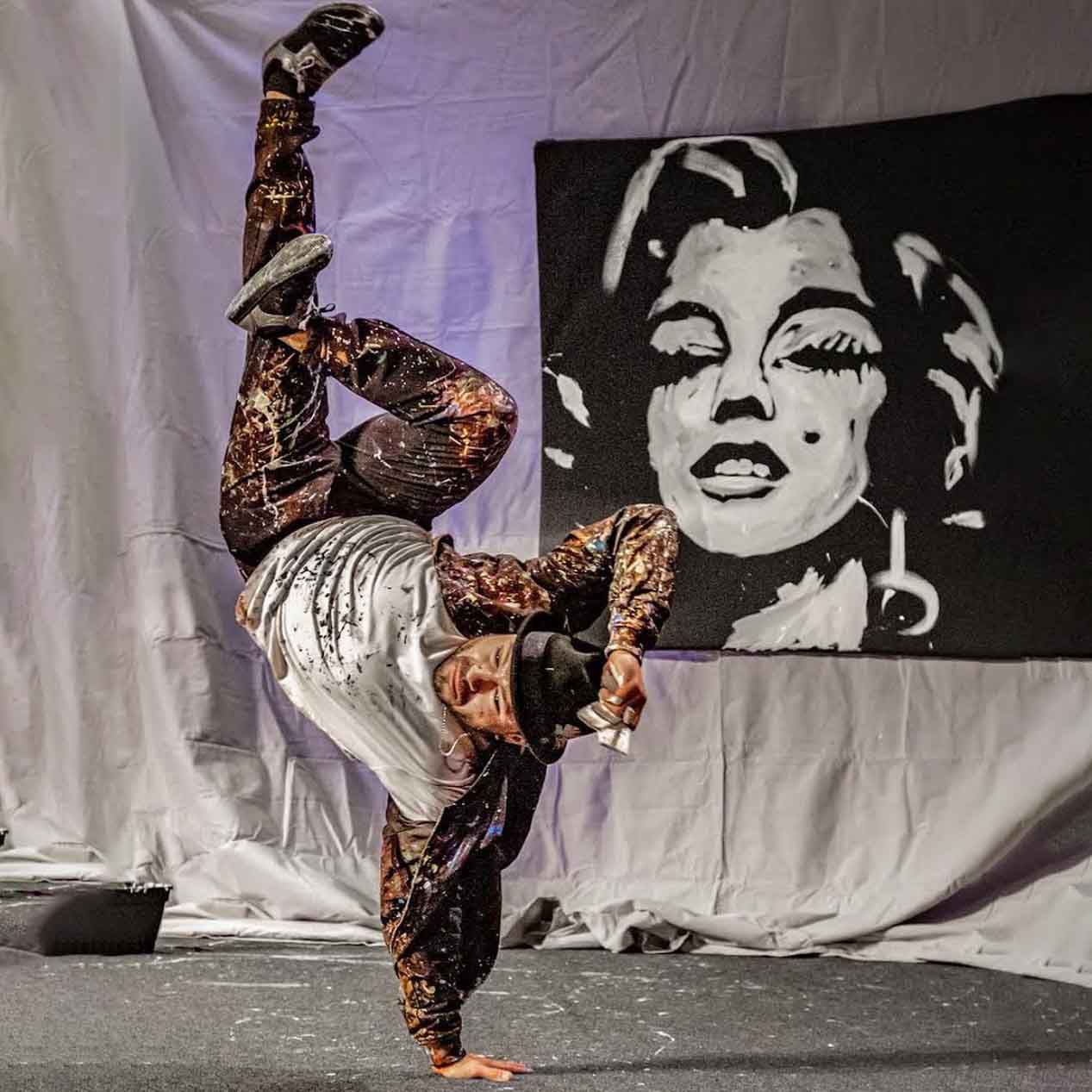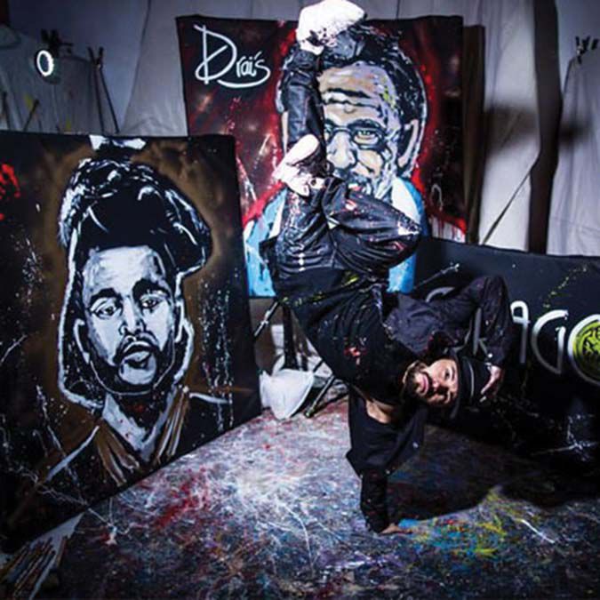 Perfect for corporate events where you want to wow guests with a portrait of a VIP guest, product launches where a company logo can be revealed, club nights and exhibitions, our live artist is also a professional choreographer and breakdancer and brings his passion for music into his event art performances.