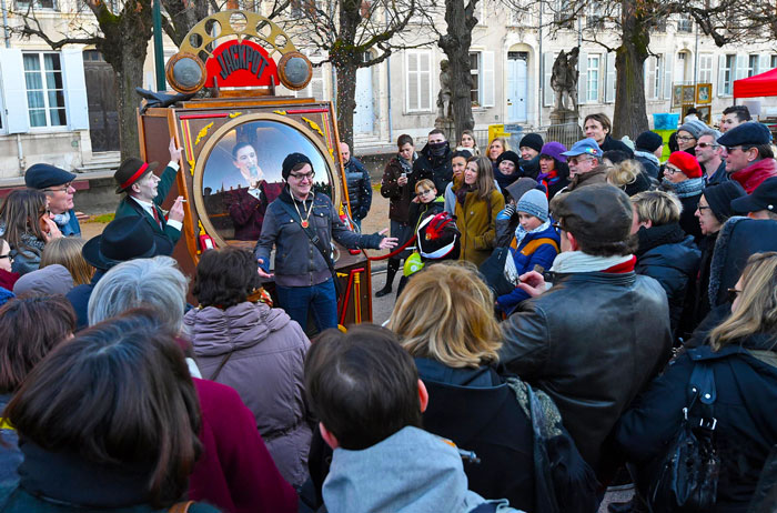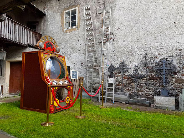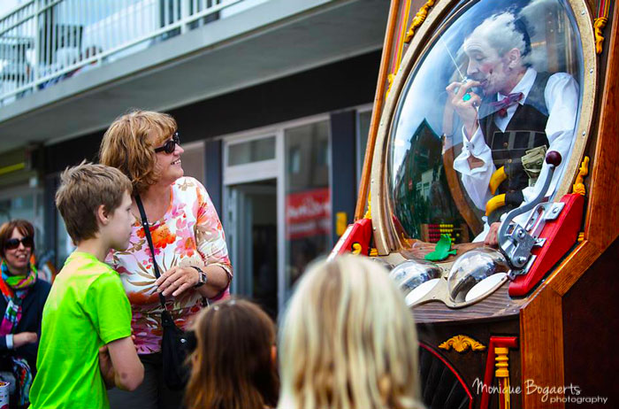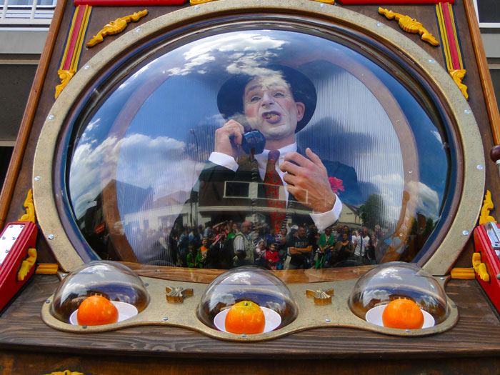 Do you fancy your luck on this quirky fruit machine? The Living Jackpot Machine has three distinctly different amusing characters inside it that rotate from one to another when the lever is pulled. The vintage characters encourage members of the crowd to come and have a go and they decide, not at random and rather unfairly, who gets to be a lucky winner.