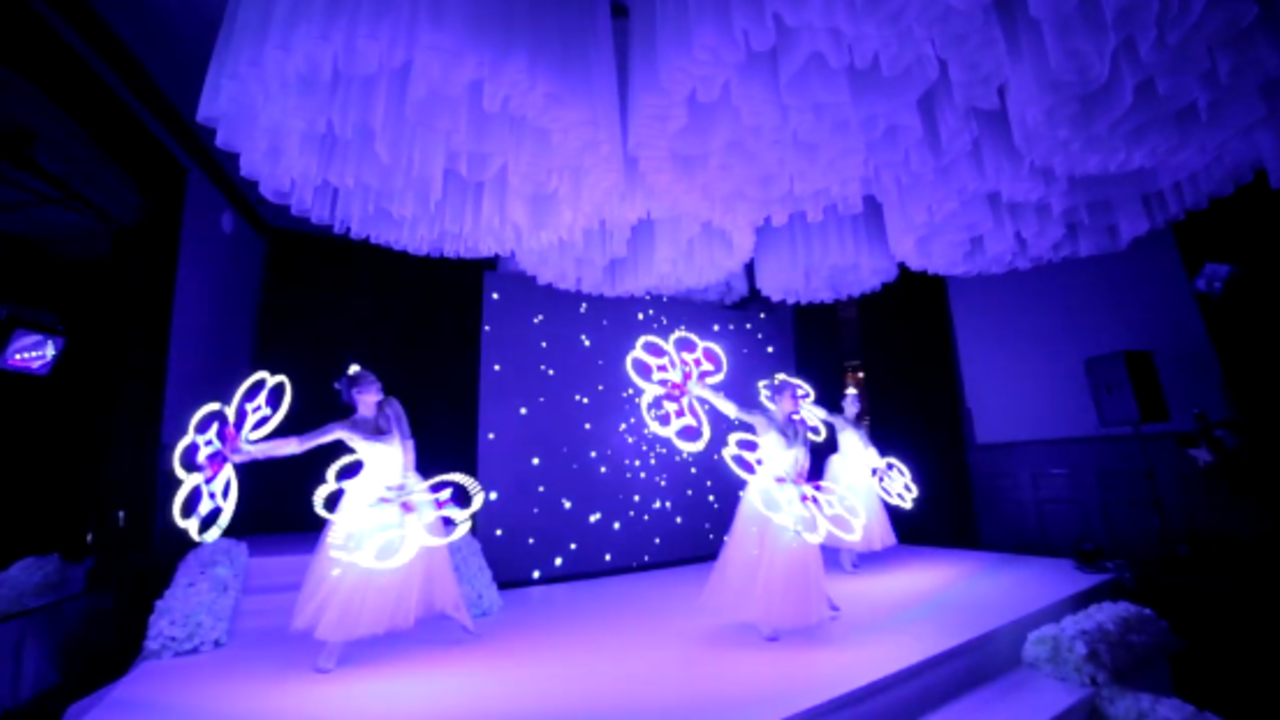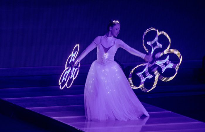 Even though the show is especially recommended for parties and events taking place at night, our white luminous show can be adapted to your venue and your needs. This ballet alike dance doesn’t require a complete blackout to be carried out, so it could be performed both indoors and outdoors, whether permitting.