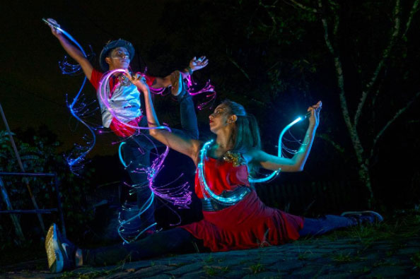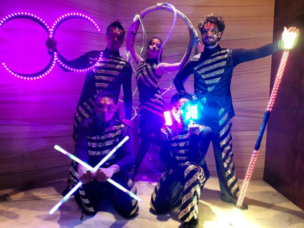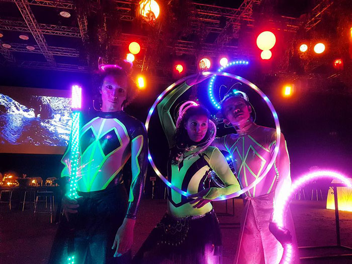 The crowd pleasing LED show is incredibly versatile and very customisable too. The glow show usually includes four circus performers but you can add more to increase the impact or add more diversity. You may pick and chose the types of LED and glow poi props you want and the team will be more than willing to customise the glow show for you, even as far as tailoring a new choreography especially for your event.