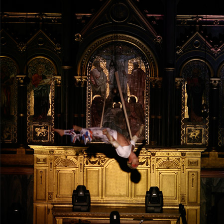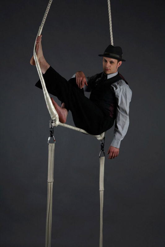 A graduate of The National Centre of Circus Arts, this talented male aerialist is trained in dance and gymnastics as well as circus skills. Able to incorporate aerial tissue, corde lisse, static trapeze, bungee and harness work into his creative routines, our amazing aerial artist can adapt his performance to suit the specific requirements of your event and even incorporate your company logo into his costume.