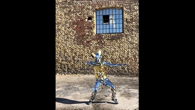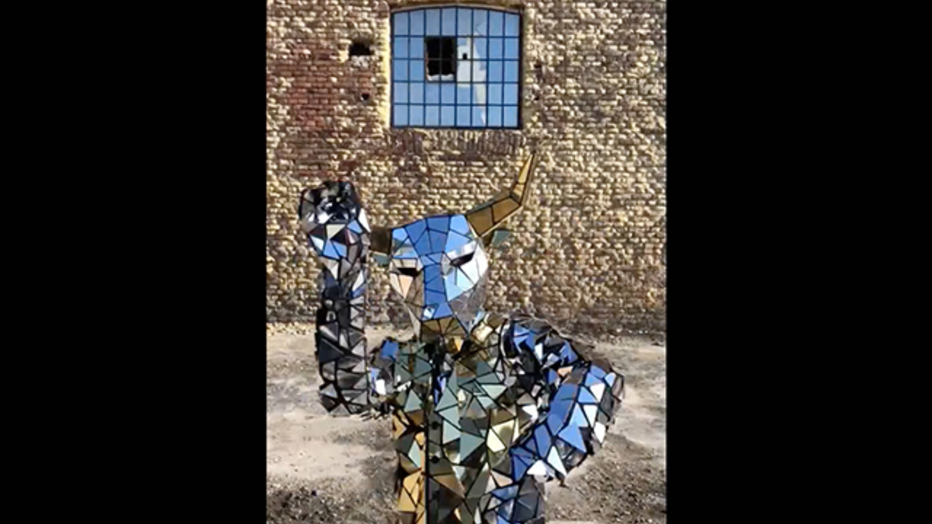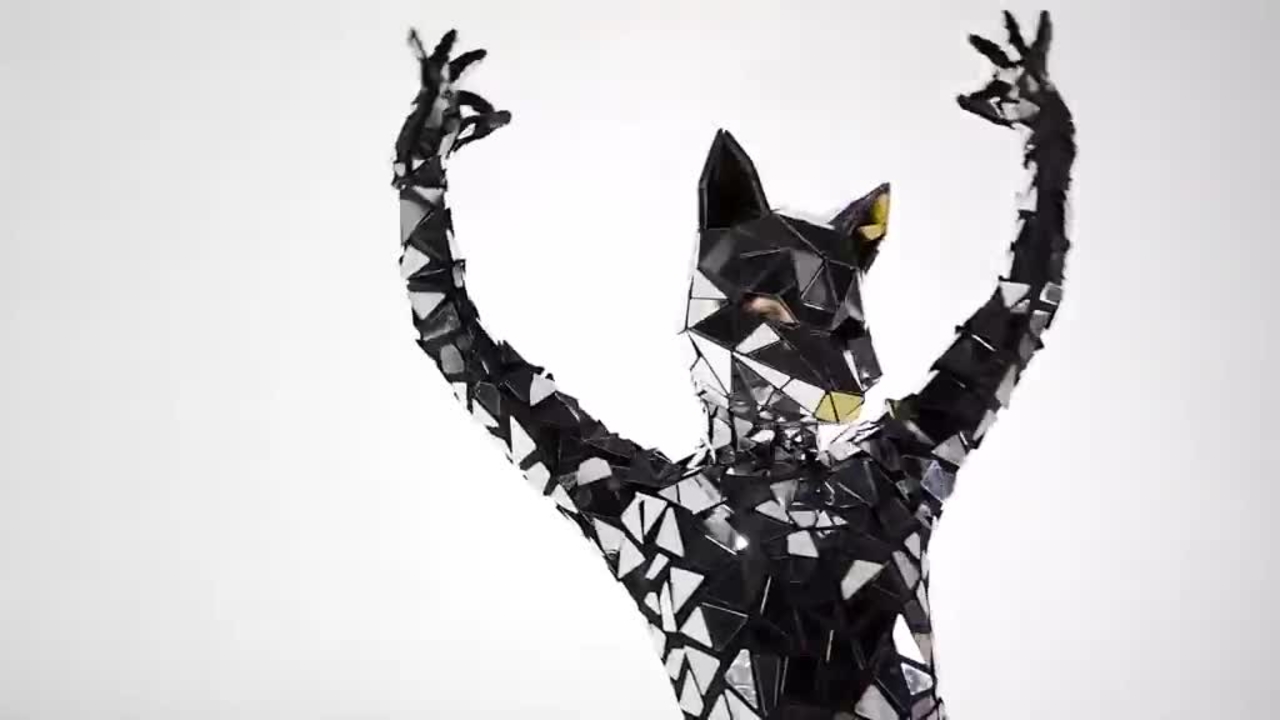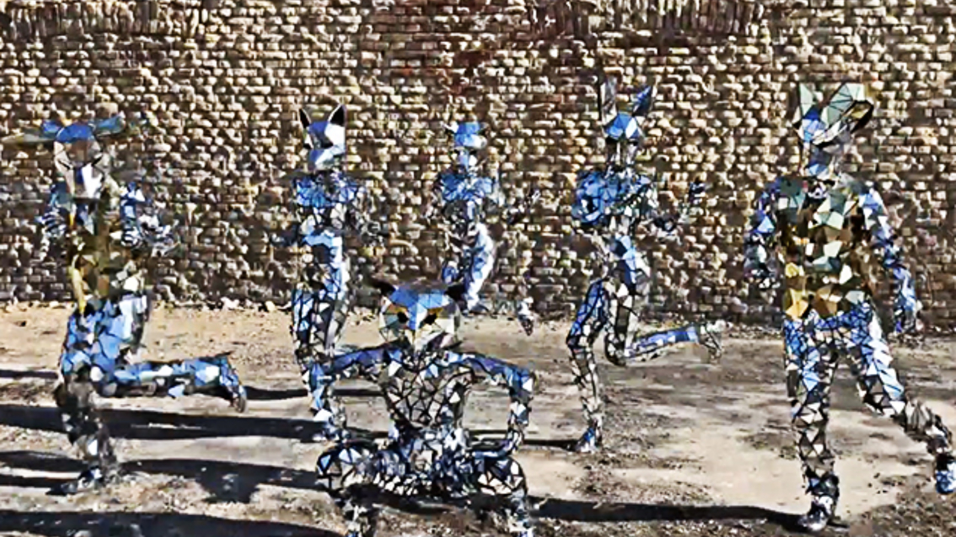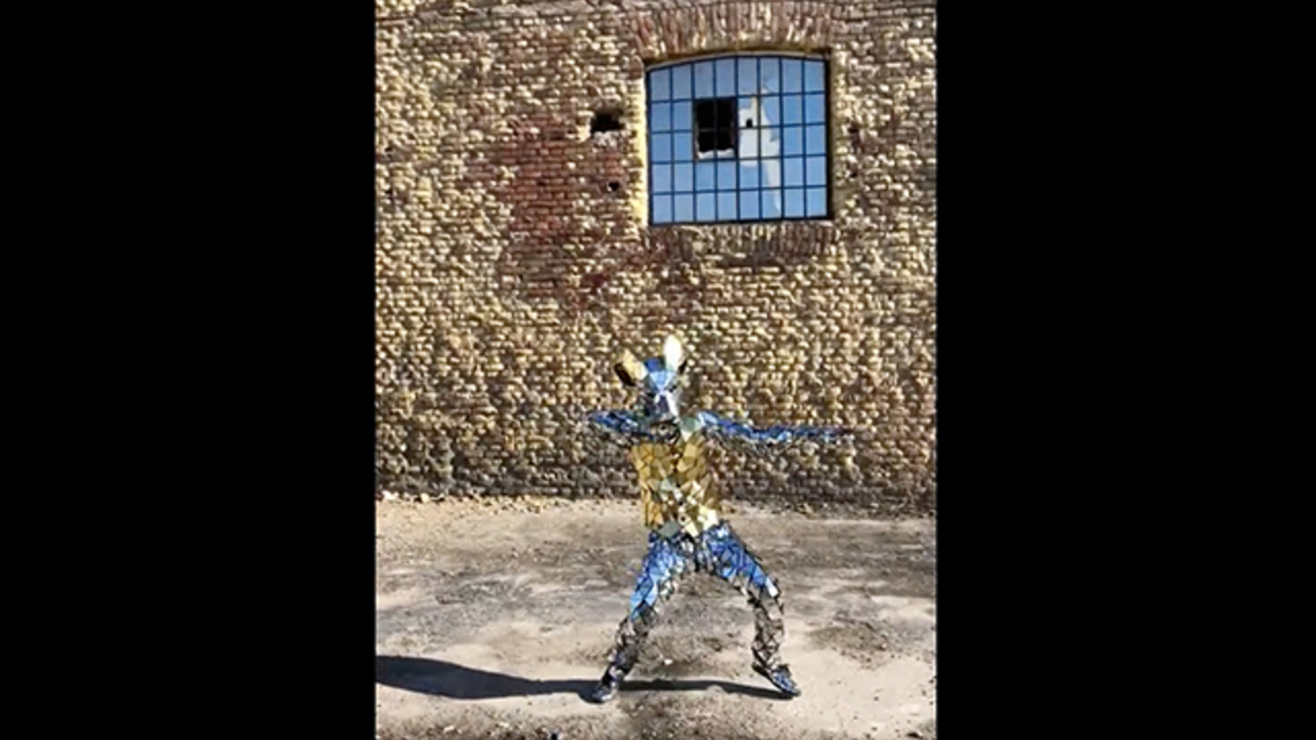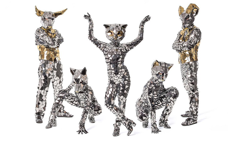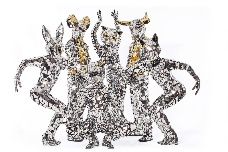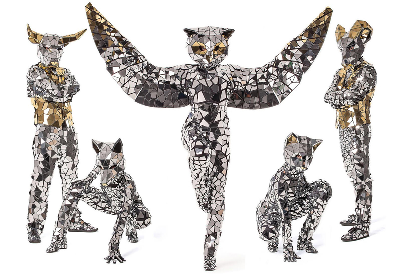 Glimmering mirror dancers dressed in gorgeous silver costumes with golden details and animal-shaped masks