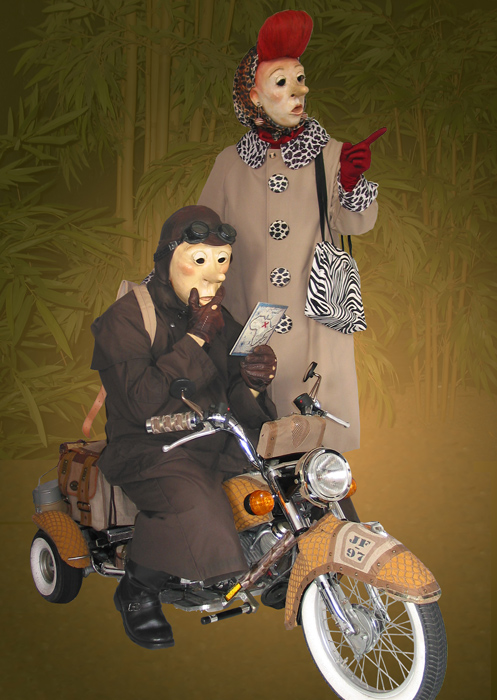 This motorcycle couple's unusual entertainment is endearing, quirky and comical at the same time. The cartoon characters are so striking that they will never pass unnoticed!