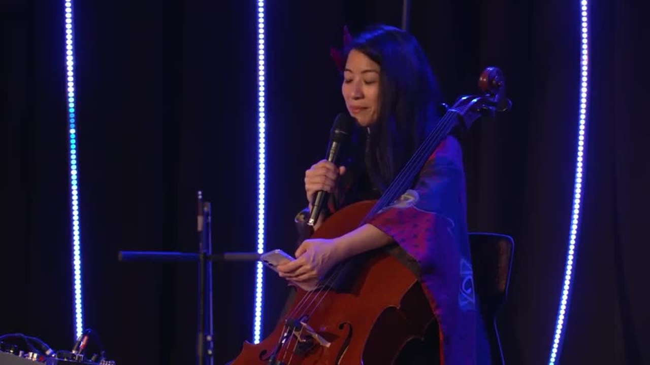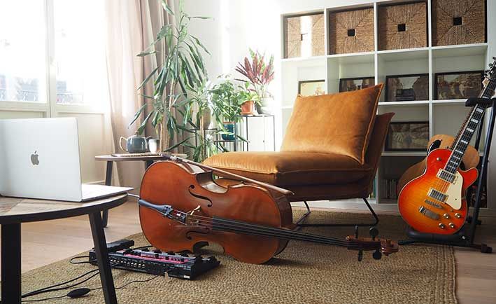 The show is set up in the artist's living room. There is a professional audio soundcard with a two-microphone set-up for audio, one for voice and one for the cello.