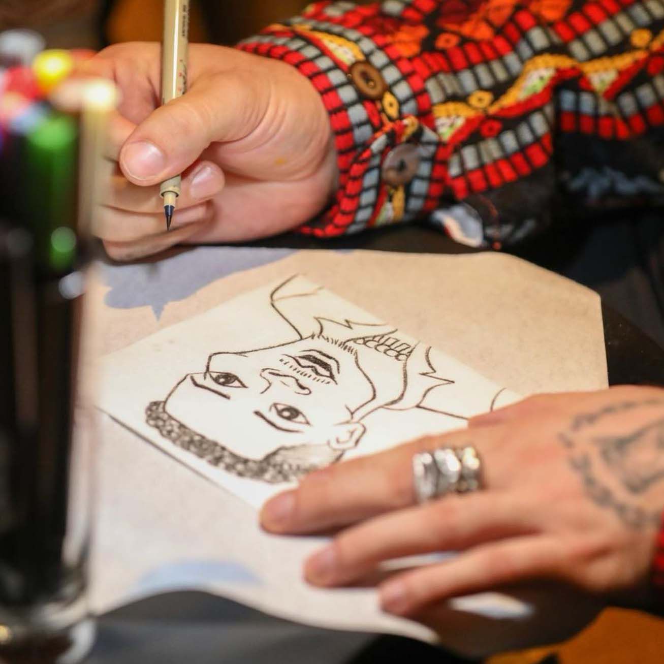 Today, this creative genius is available to hire to draw portraits live at corporate events as well drawing artistic creations for private individuals. Creating bespoke and memorable keepsakes at each event, the Napkin Caricaturist is a truly unique entertainment option.