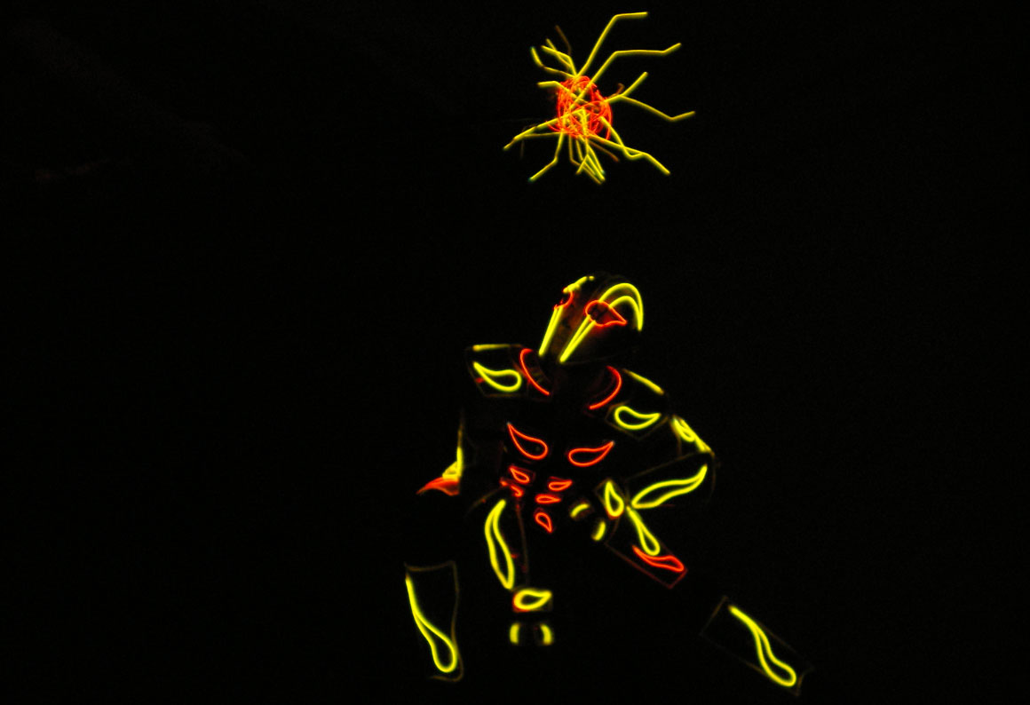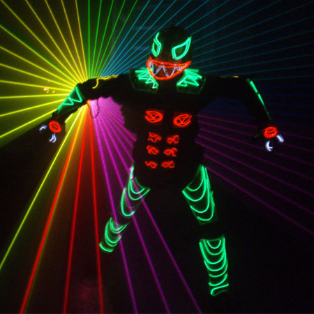 They provide a service for costume design and logo construction as well as prop making. They can create a glow suit that fits perfectly with the client's ideas for a specific event or campaign. They can also customise our existing costumes to add logos or key features. They have experience with LED, Elwire, and Laser technologies and the know how to incorporate them into durable costumes and sculptures.