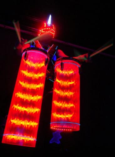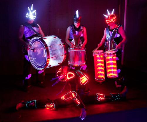 The uniqueness of the Cyber drum Show is the unusual LED costumes of the drummers. Each light musical instrument does not only enliven the LED glow of the costumes of the musicians, but also manages a complex electronic cyber-costume of a dancer. This creates an extraordinary combination of sound and light.