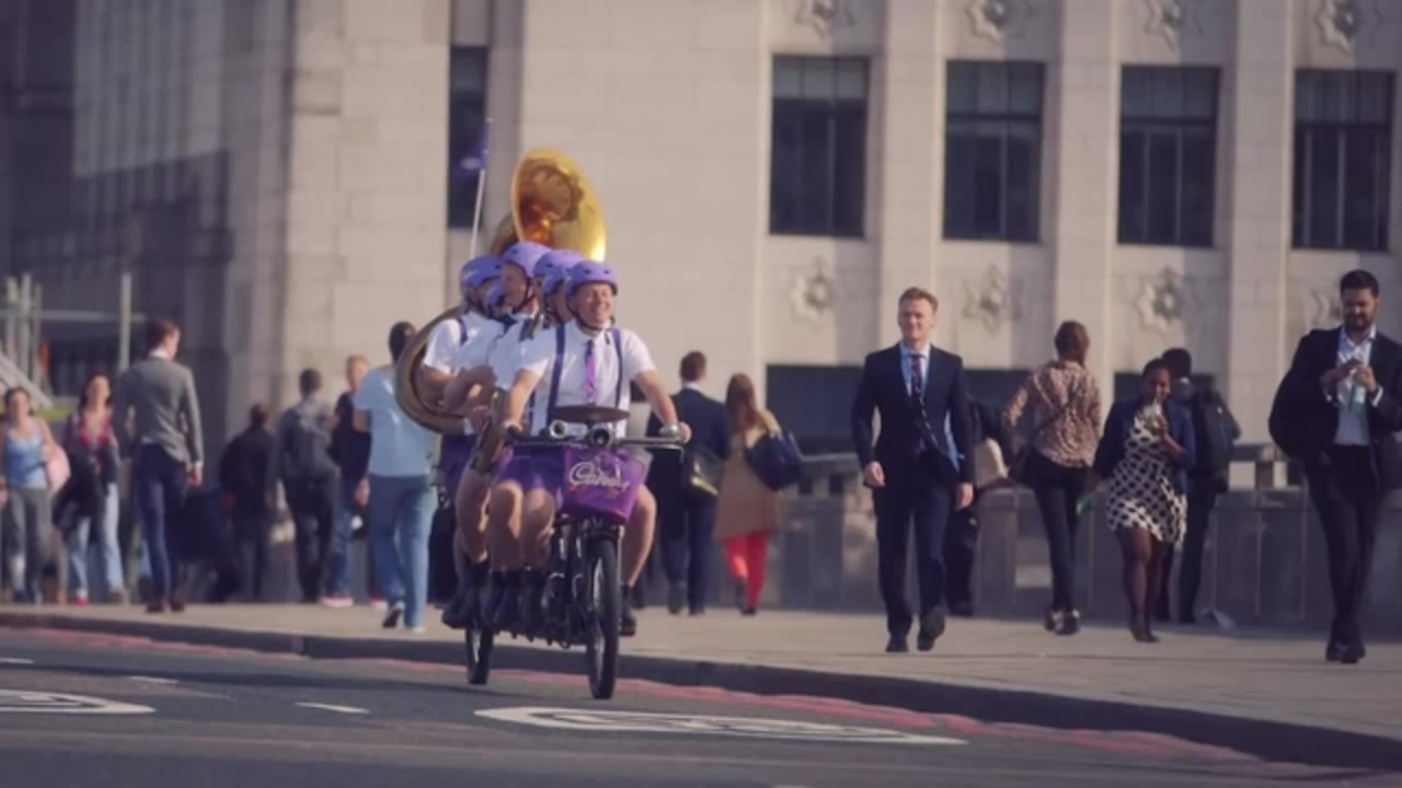 The comedy musicians can be booked is smart, fanfare style costumes, 1930s racing cyclist outfits or as Father Christmases’. They are very open to branding and customising options including having logos added to the big drum on the bike. Their costumes and bike had a full makeover for a Cadbury’s advert. You can see that video above.