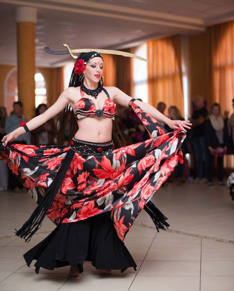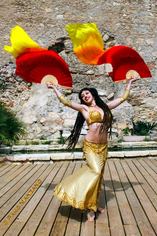 A specialist in different styles of oriental dances offers shows with swords, fans and isis wings