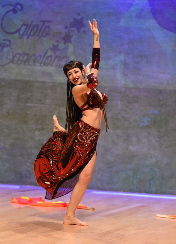 Our Spanish belly dancer always welcomes the opportunity to work with other artists. Happy to be part of a parade or a bigger show or theatre production, she can adapt her oriental dance choreographies to different situations and performance spaces. In the past, she has had the privilege to perform along well-known artists in the field such as Sadie, Naima Bakkali or Victoria Ivannova, to name a few.