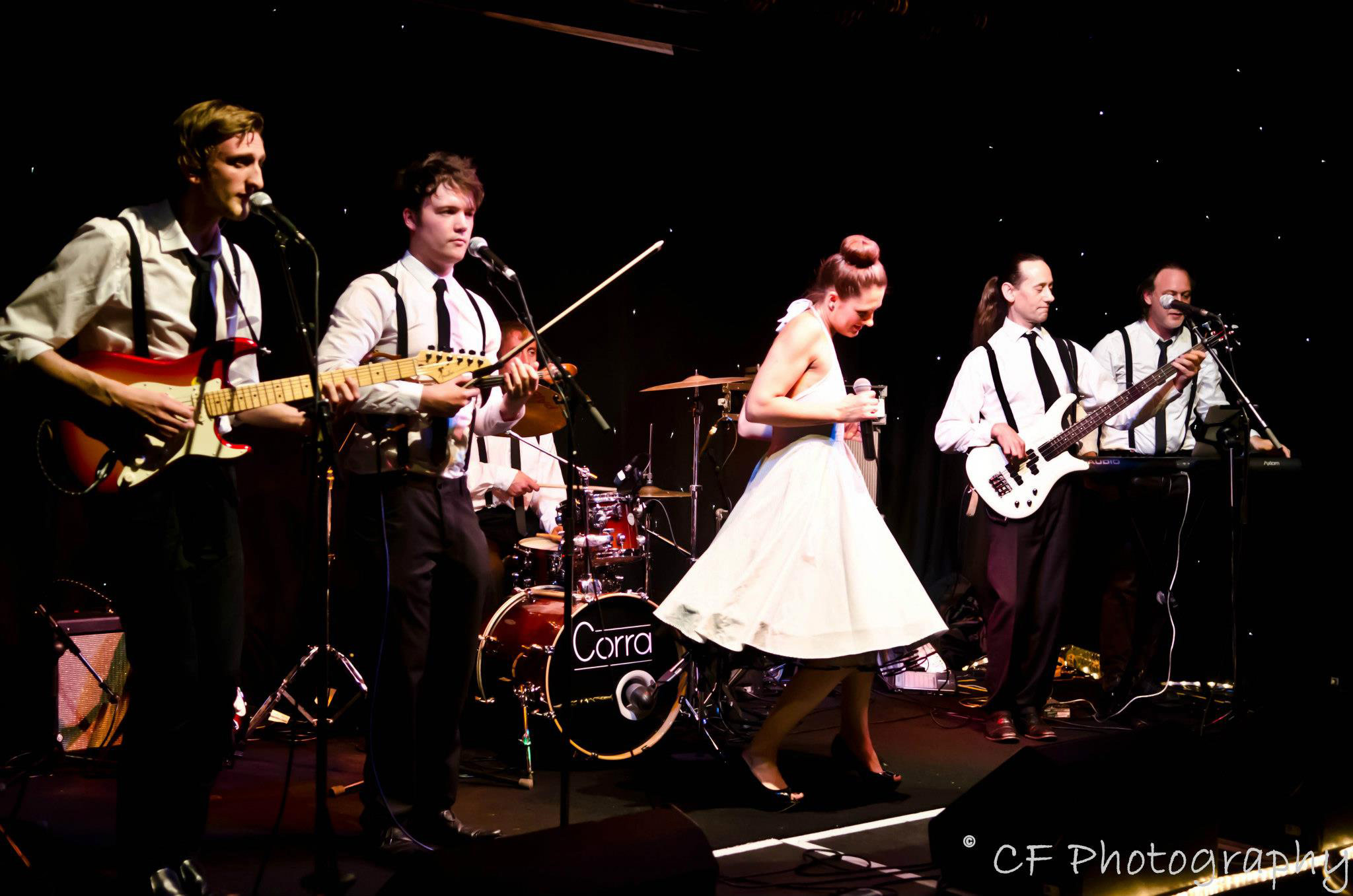 The group effortlessly switch between genres performing styles ranging from modern hits, classic party anthems, infectiously funky ceilidh, Rock n Roll, Soul, swing & Funk.
