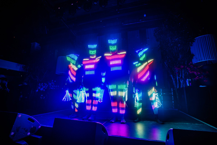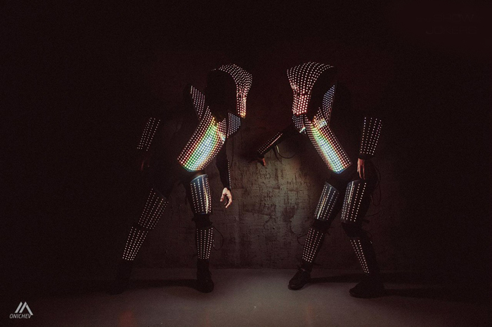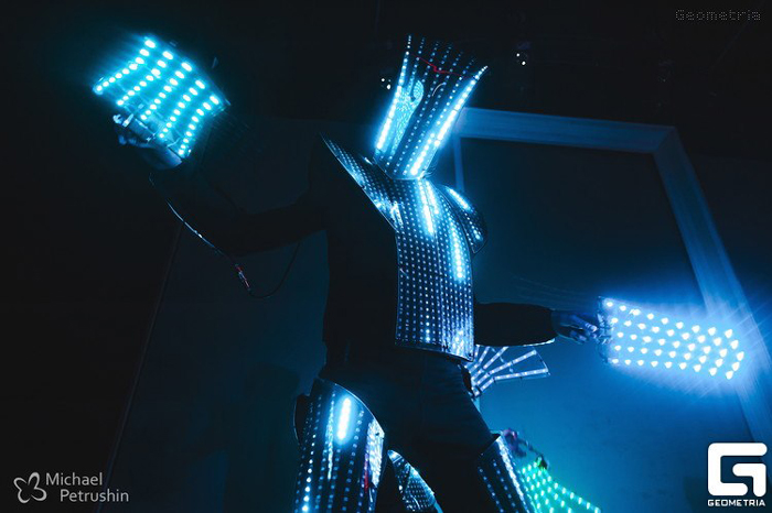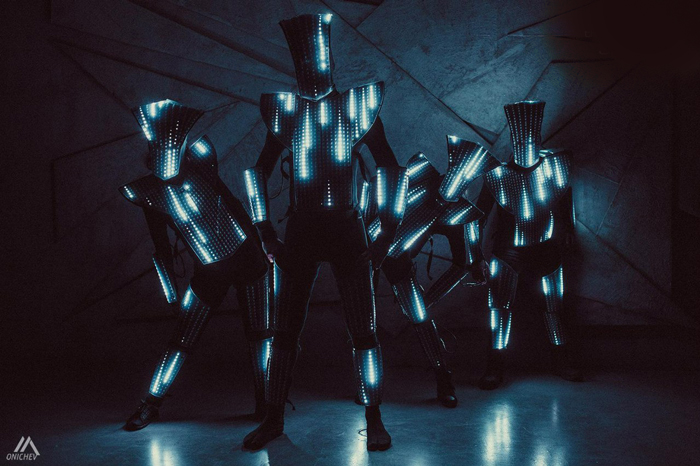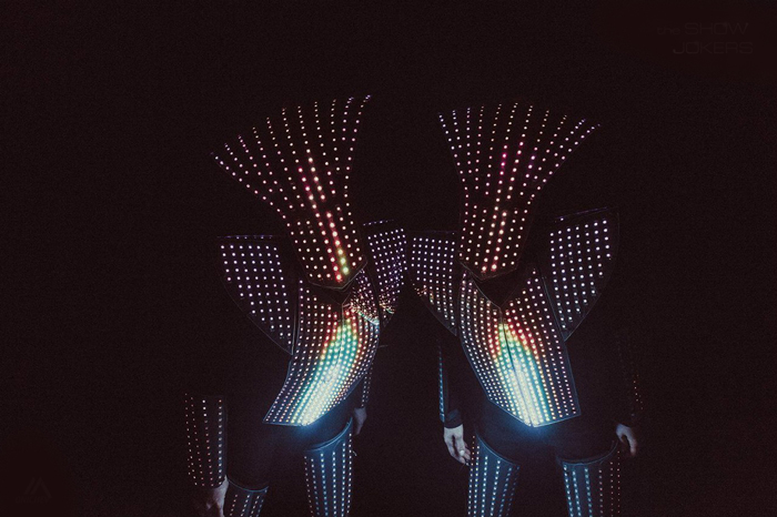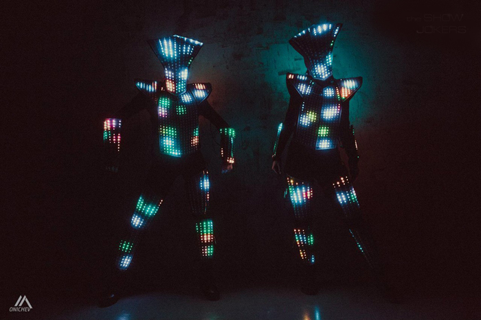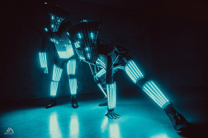 The Pixel LED Dancers Russia have some of the most technologically advanced costumes with hundreds of strategically placed LED light forming pixel grids. All lights about their person can be tailored and programmed to form a unique sequence whether its block colours, specific patterns or even logos. Their high-end customisable LED show is a popular choice because they can display animated LED text on the suits
