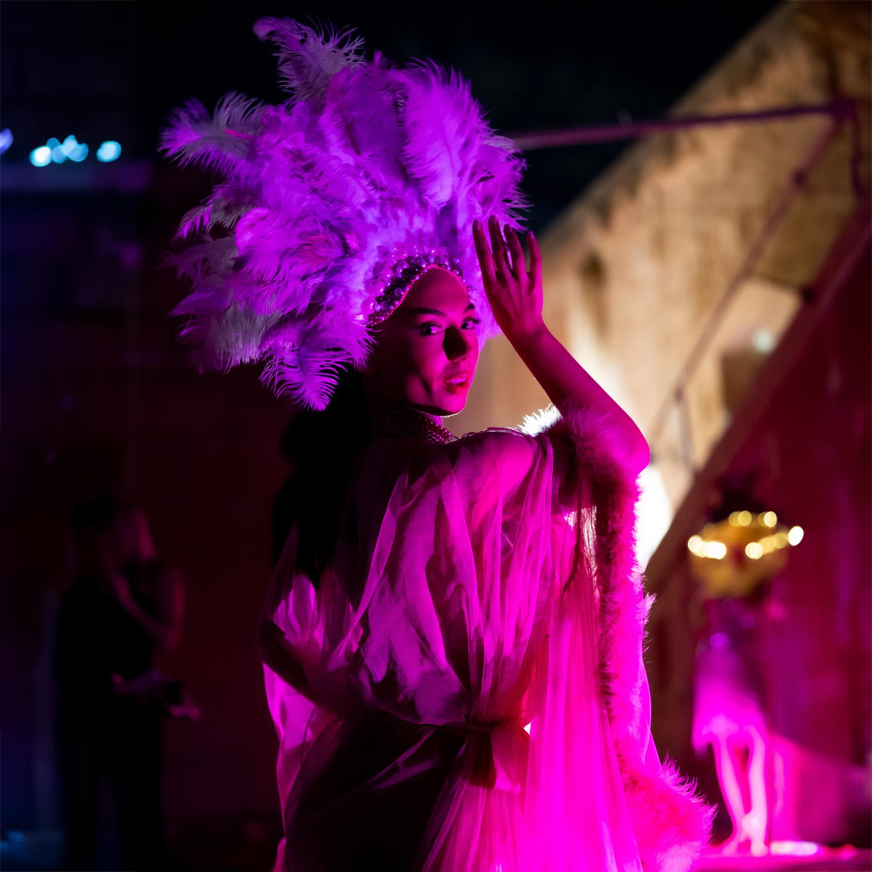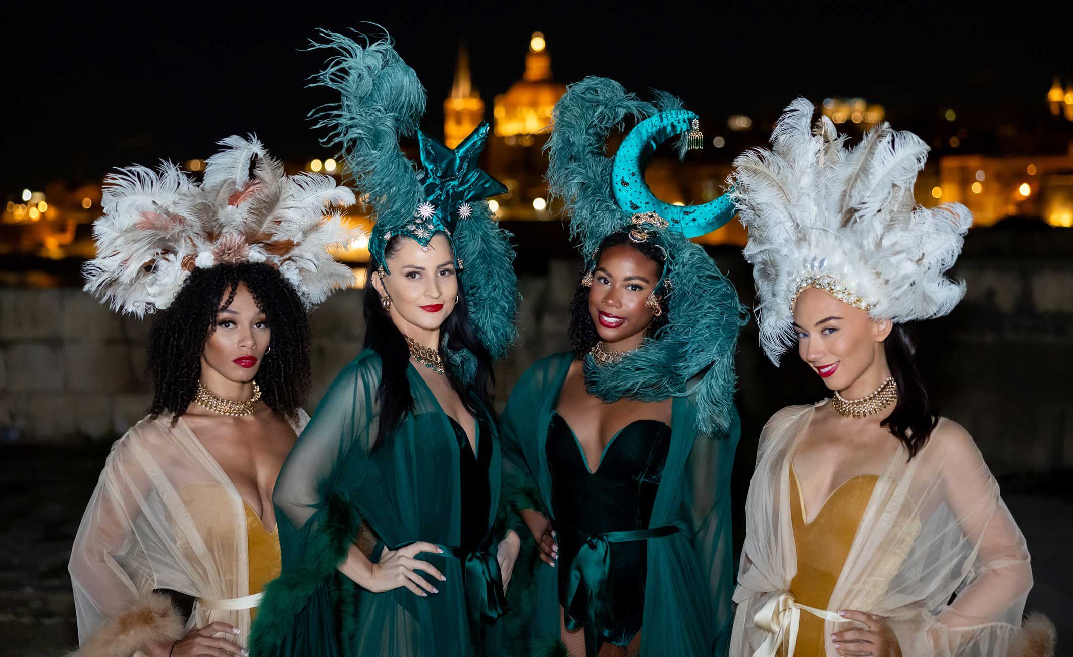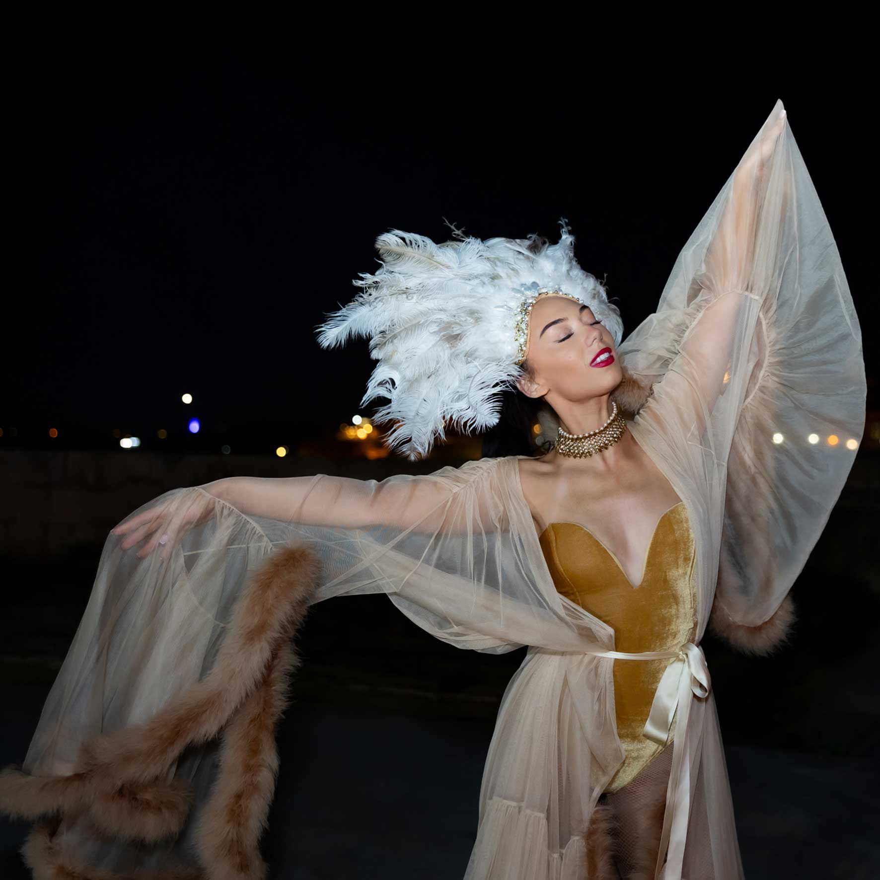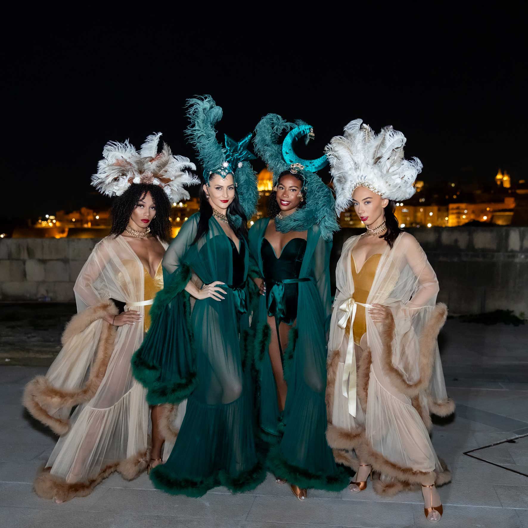 Dressed in elegant, high-end costumes featuring feathered headdresses and glamorous fluffy gowns, our girls make a fantastic photo opportunity