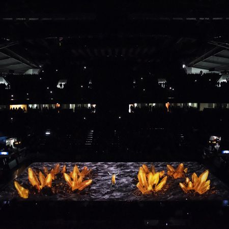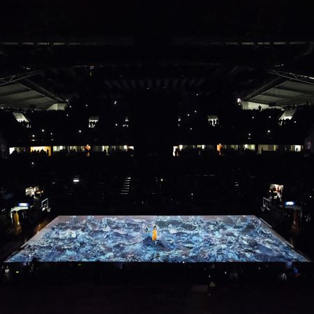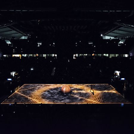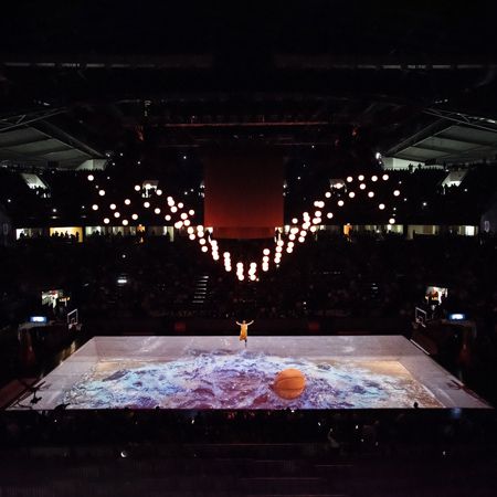 The basketball court acts as a canvas for detailed animations to be projected, while a performer appears to control the visuals for dramatic effect