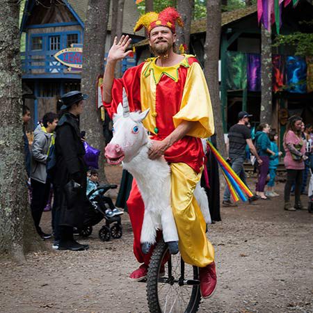 " Rainbow Unicorn Unicyclist made his Renaissance Faire debut at King Richard’s Faire and was a hit! The audience loved his unicorn cycling around the faire site, as well as his fun, action packed show. He is a pleasure to work with and his upbeat, affable nature is welcome. "