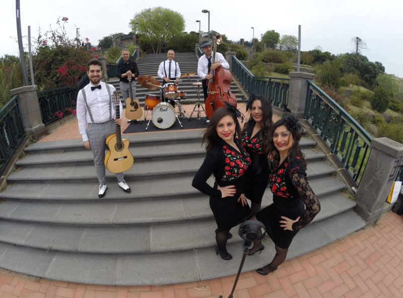 Accompanied by four live musicians, our singers have specialised in retro swing music inspired by the famous English vocal trio the Puppini Sisters. Wearing beautiful vintage dresses, red cherry lipstick and retro hairstyles, they will transport listeners back to another era!