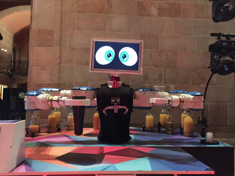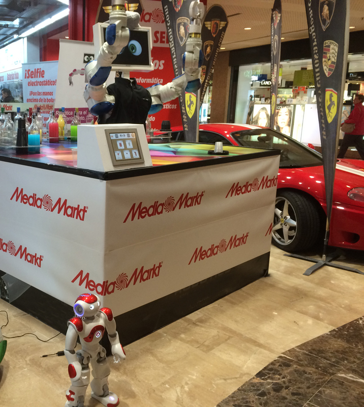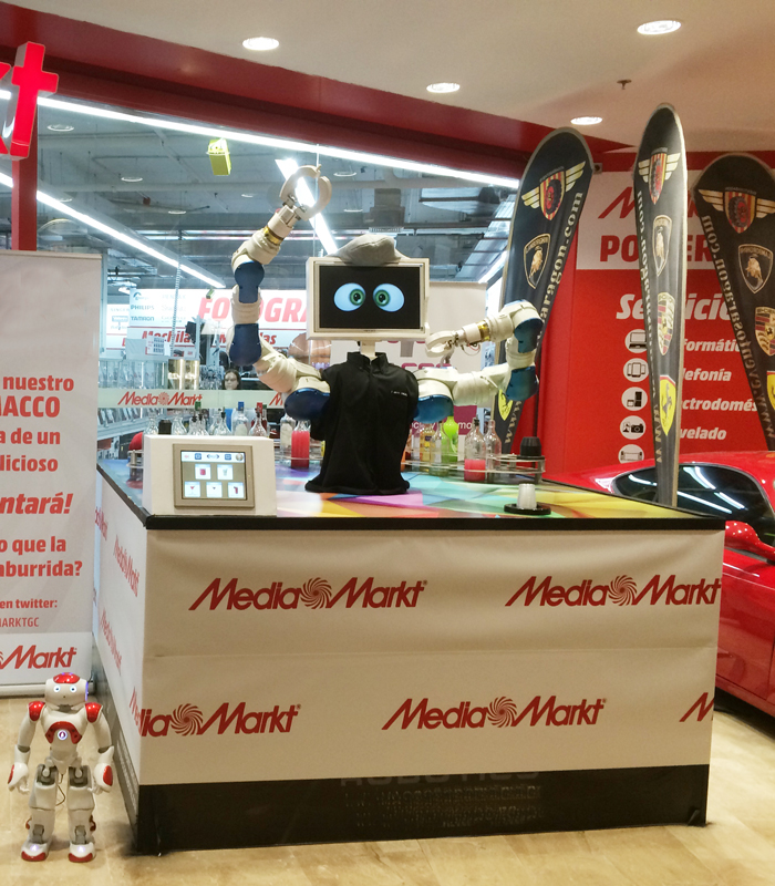 Also a television guest star, our incredible humanoid robot visited one of Spain’s most popular TV sets: El Hormiguero! This adorable robot bartender has also been the highlight of numerous promotional events held by renowned brands like Media Markt, as you can see in the pictures above.