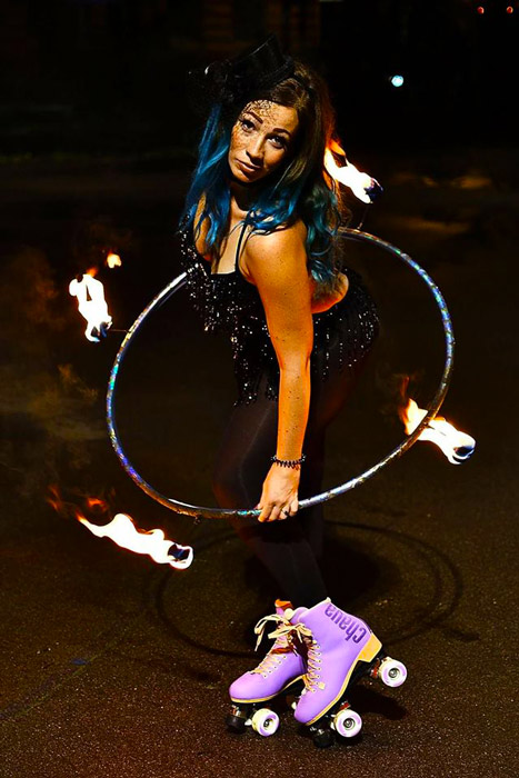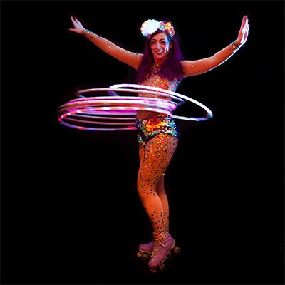Our Roller Skating Hula Hoop Act UK offer versatile performances suited to stage shows, festivals, corporate functions, themed events, promotional work, TV and media. The female hula hoop artist will very easily tailor her performance to suit client requirements and customise her appearance to suit and event them. She has previously been involved in a variety of themed events and custom-made parts of her costume.
