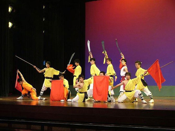 Their authentic performances include traditional costumes and choreographies from the Kung Fu and Wushu tradition and can incorporate a range of traditional instruments such as knives, sticks, poles and flags.